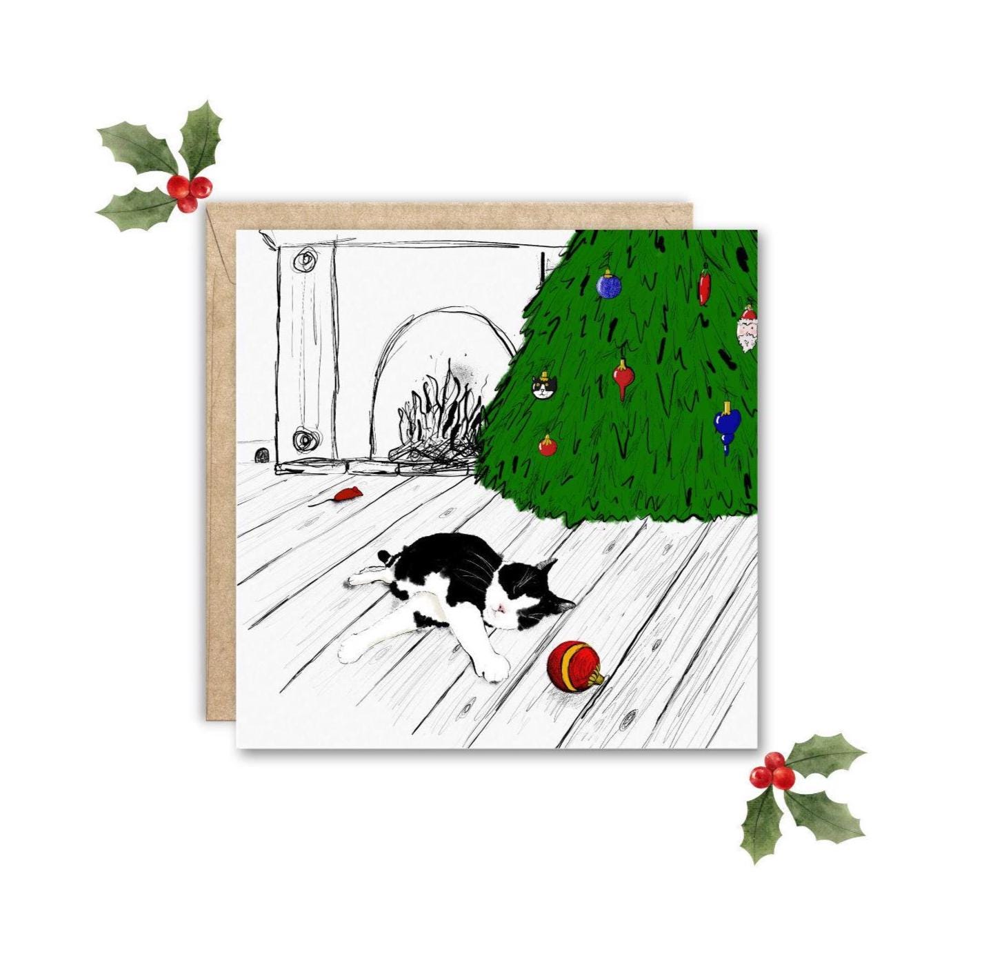 "Unique, humorous cat Christmas card featuring a black and white cat sleeping by the fire with ...