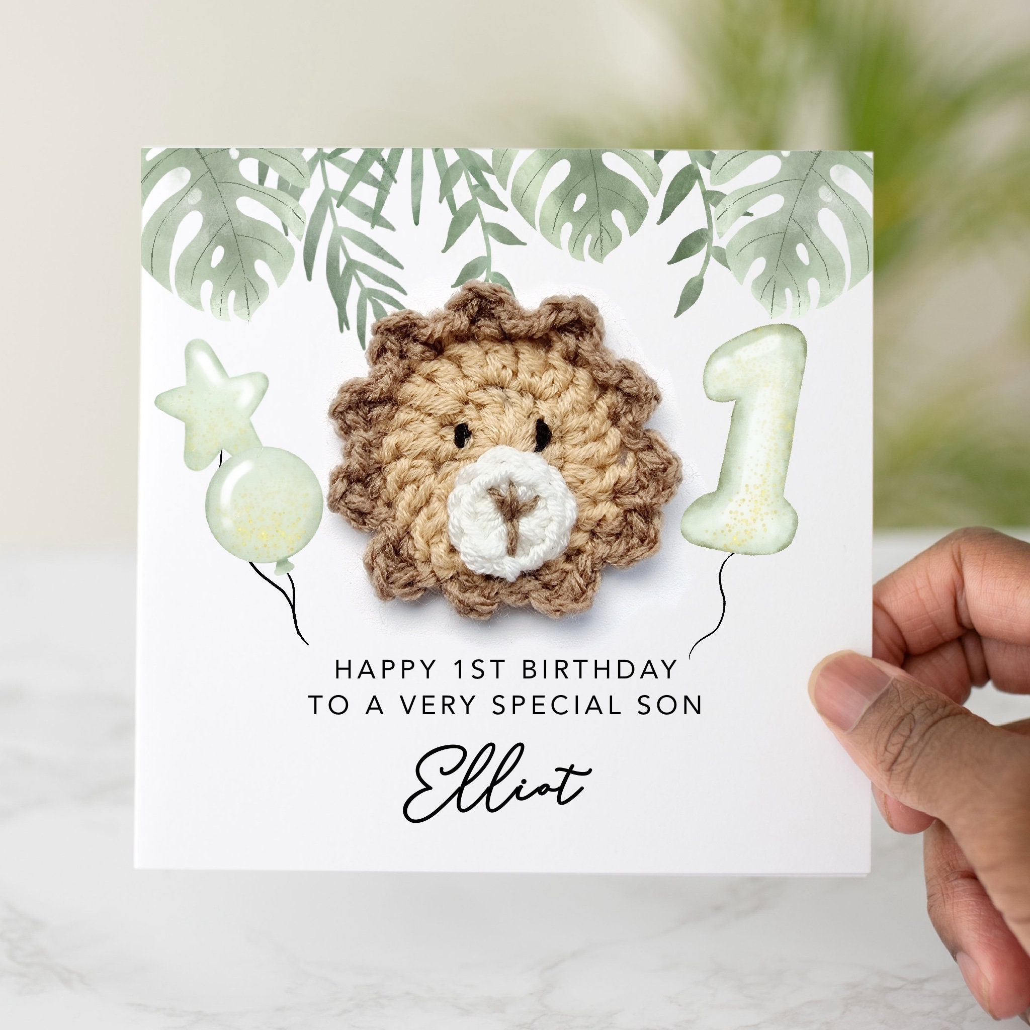Personalised Safari Lion Son 1st Birthday Card - Handmade Crochet L...