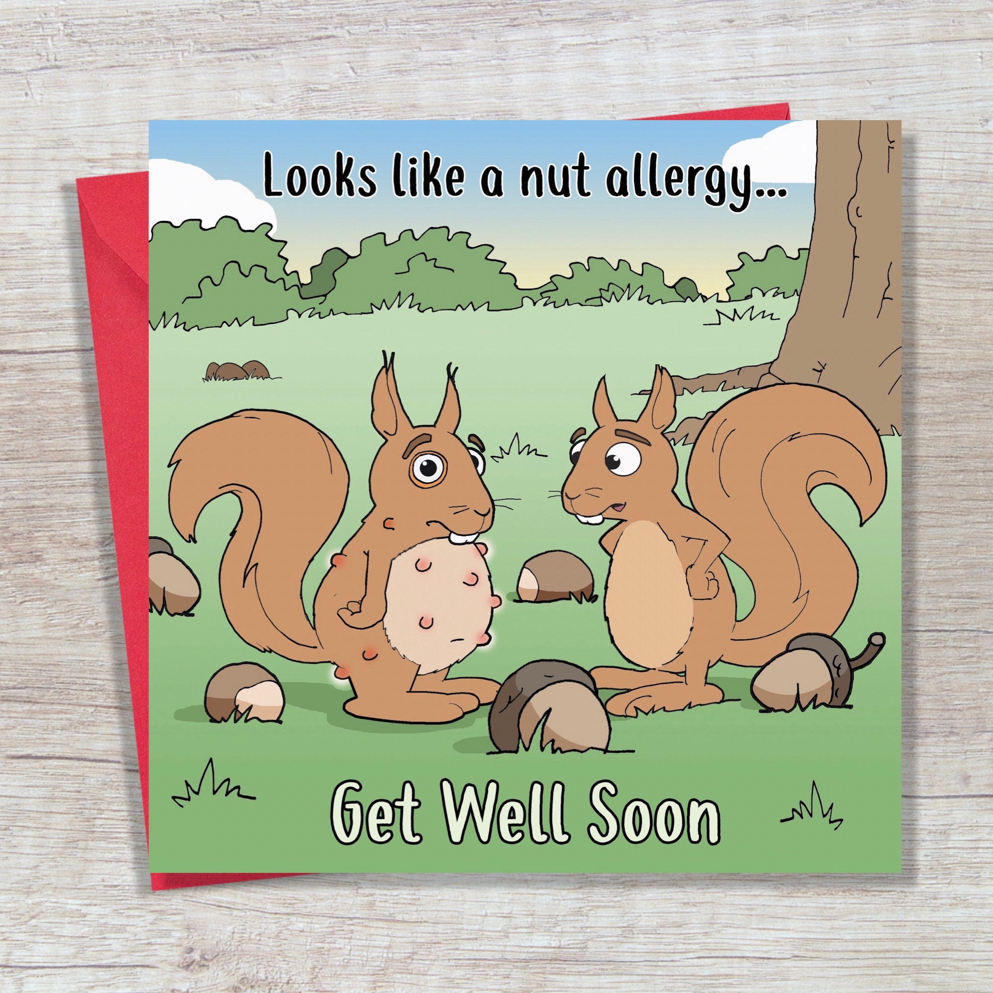 This fabulously funny get well soon card features a squirrel with a nut allergy sporting a rash... g...