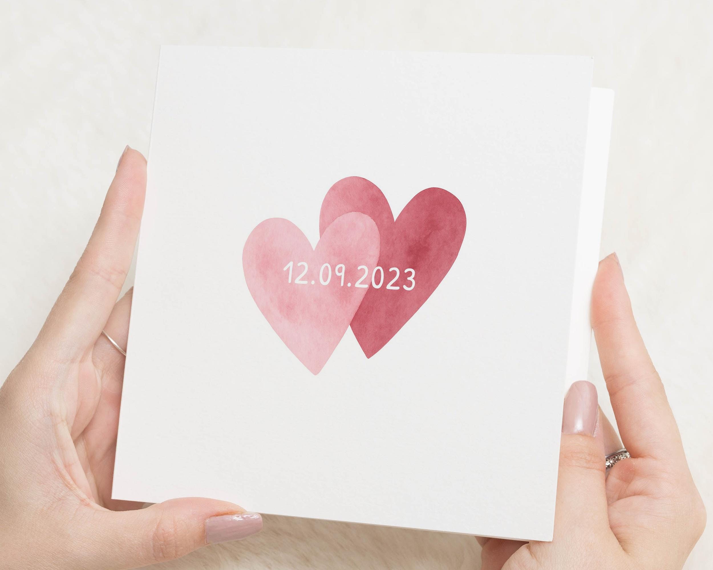 A minimalist card featuring two red hearts and a custom date, perfect for weddings, engagements, or ...