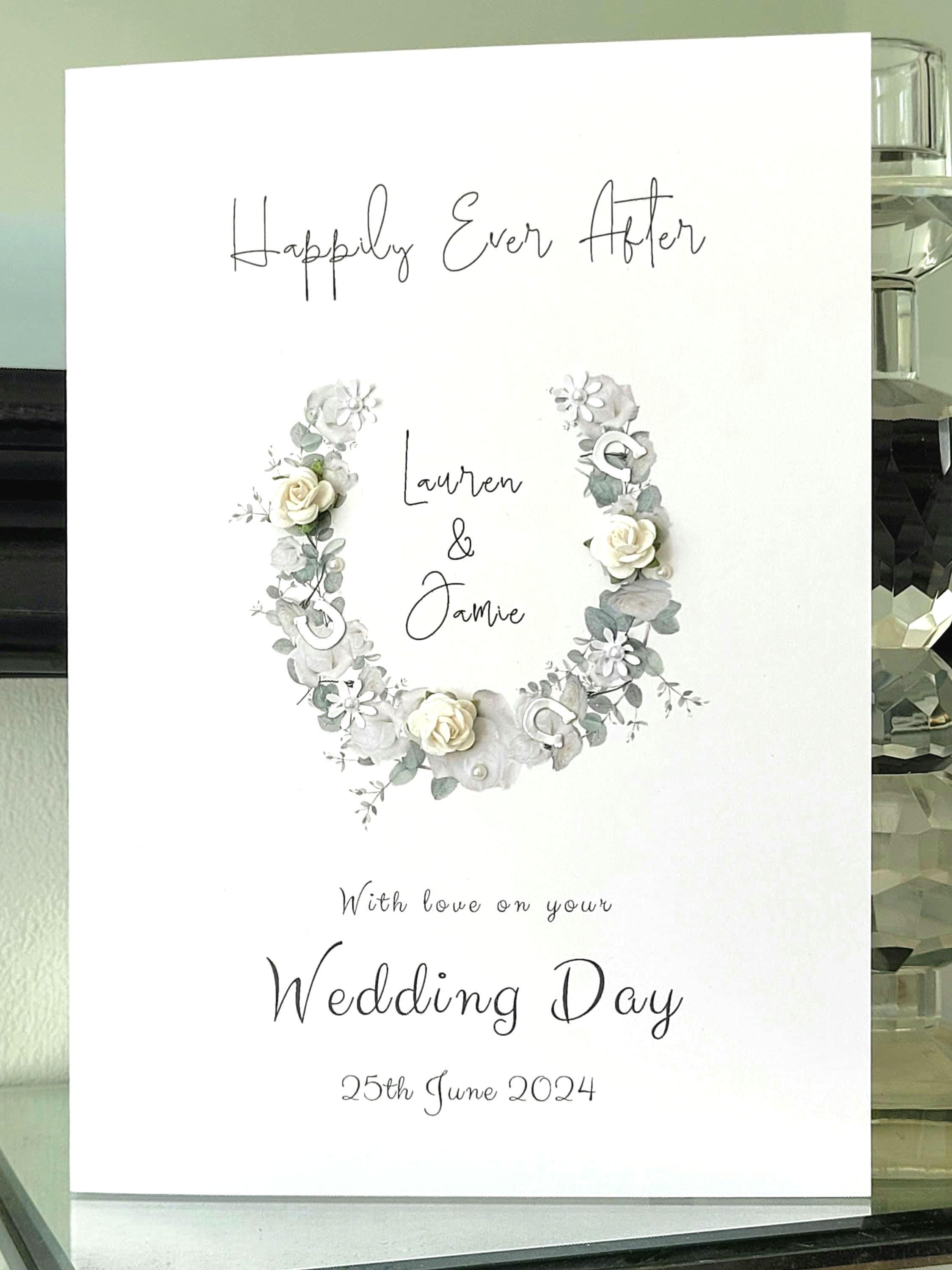 A personalised names and date horseshoe wedding day card, decorated with 3D white paper flowers and ...