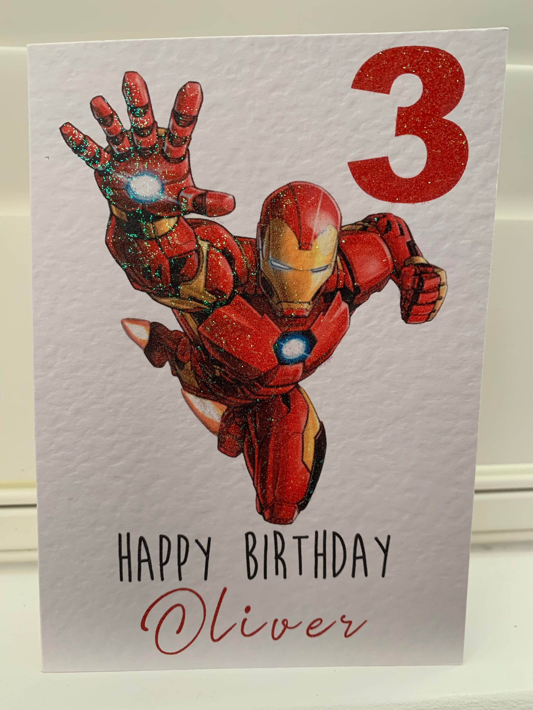 Personalised super hero card Printed on white hammered 300gsm card with glitter finish Blank inside ...
