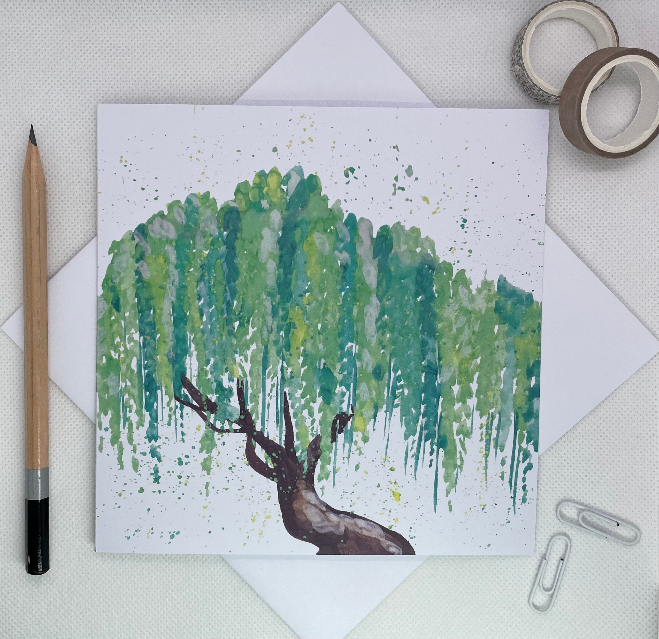 Willow Tree greetings card watercolour design Willow Anniversary print blank inside - nature - green...