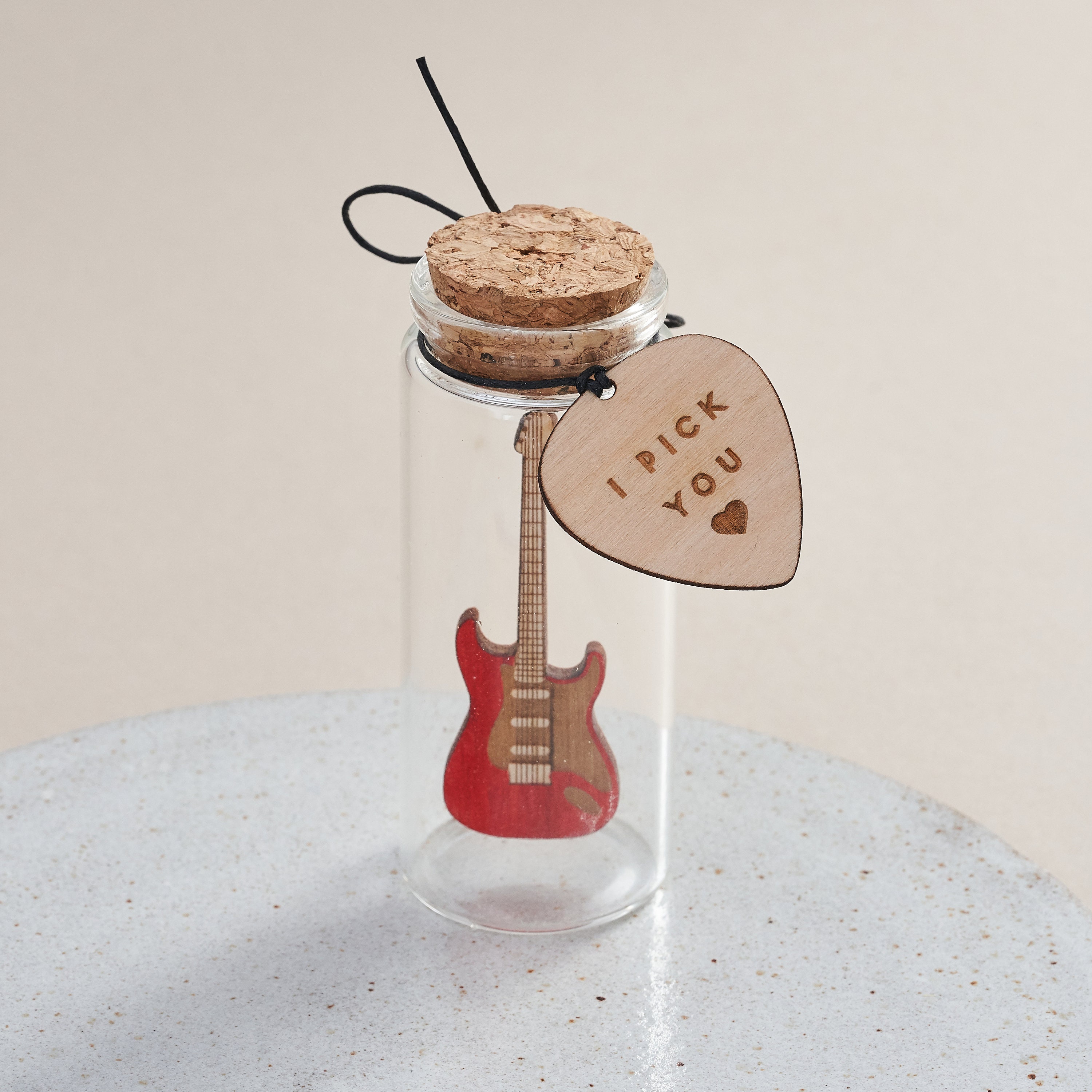 A music lovers gift for men. Personalised message bottle with miniature hand-painted wooden guitar a...