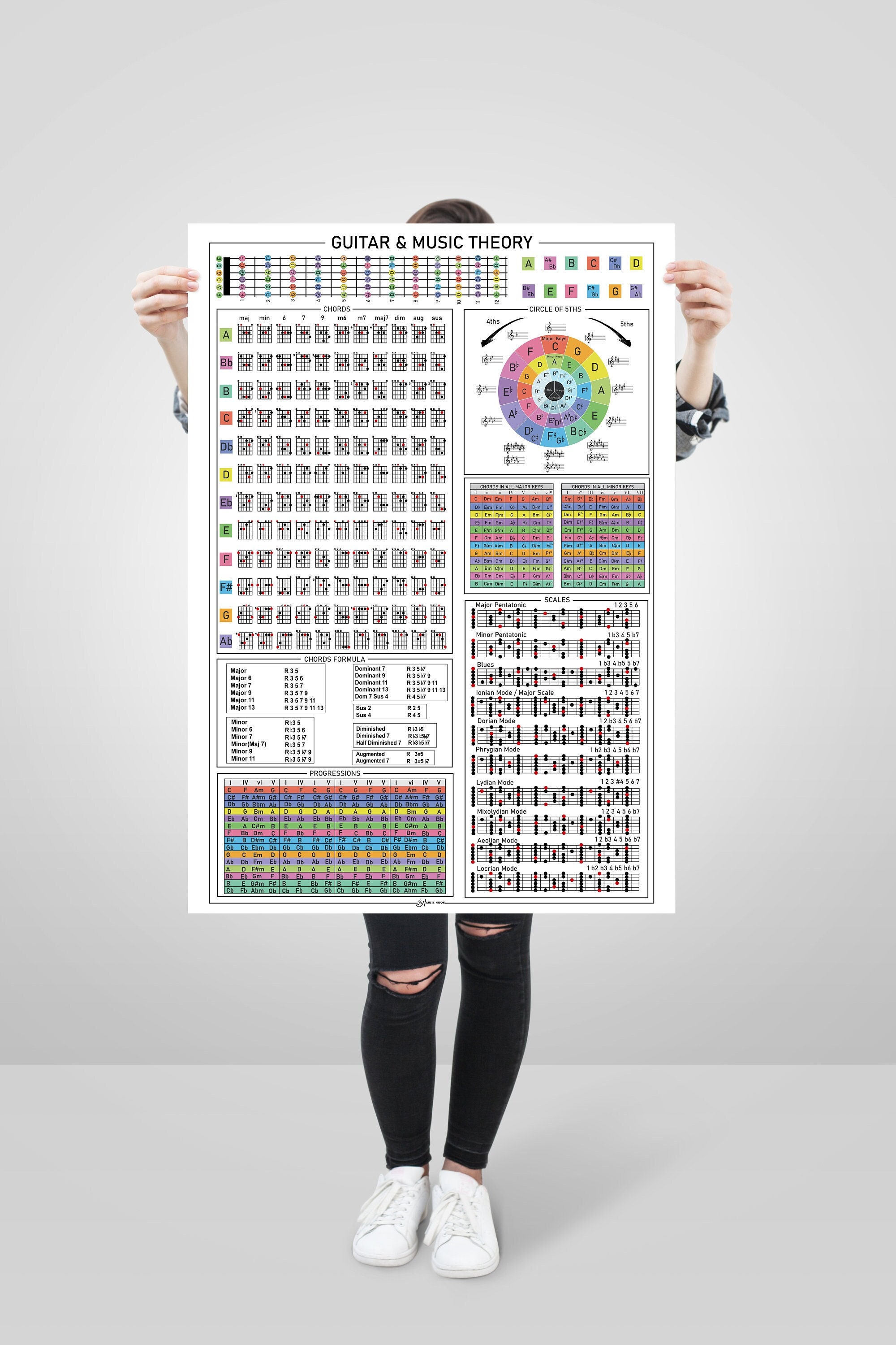 Guitar Poster | Chords, Chord Formulas, Circle of Fifths, Scales, M...