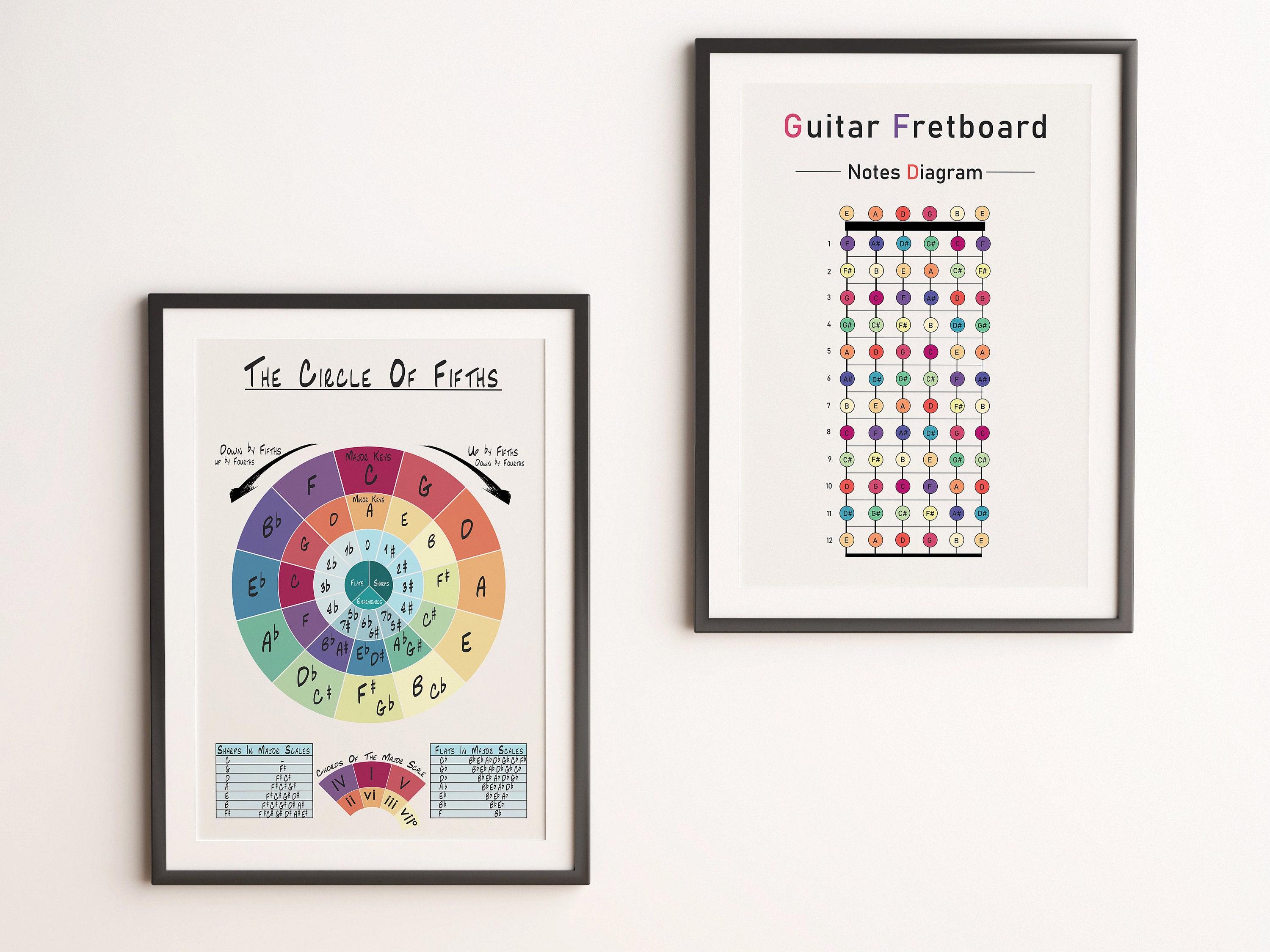 Guitar Poster Bundle, Notes Diagram Print, Circle of Fifths Printab...