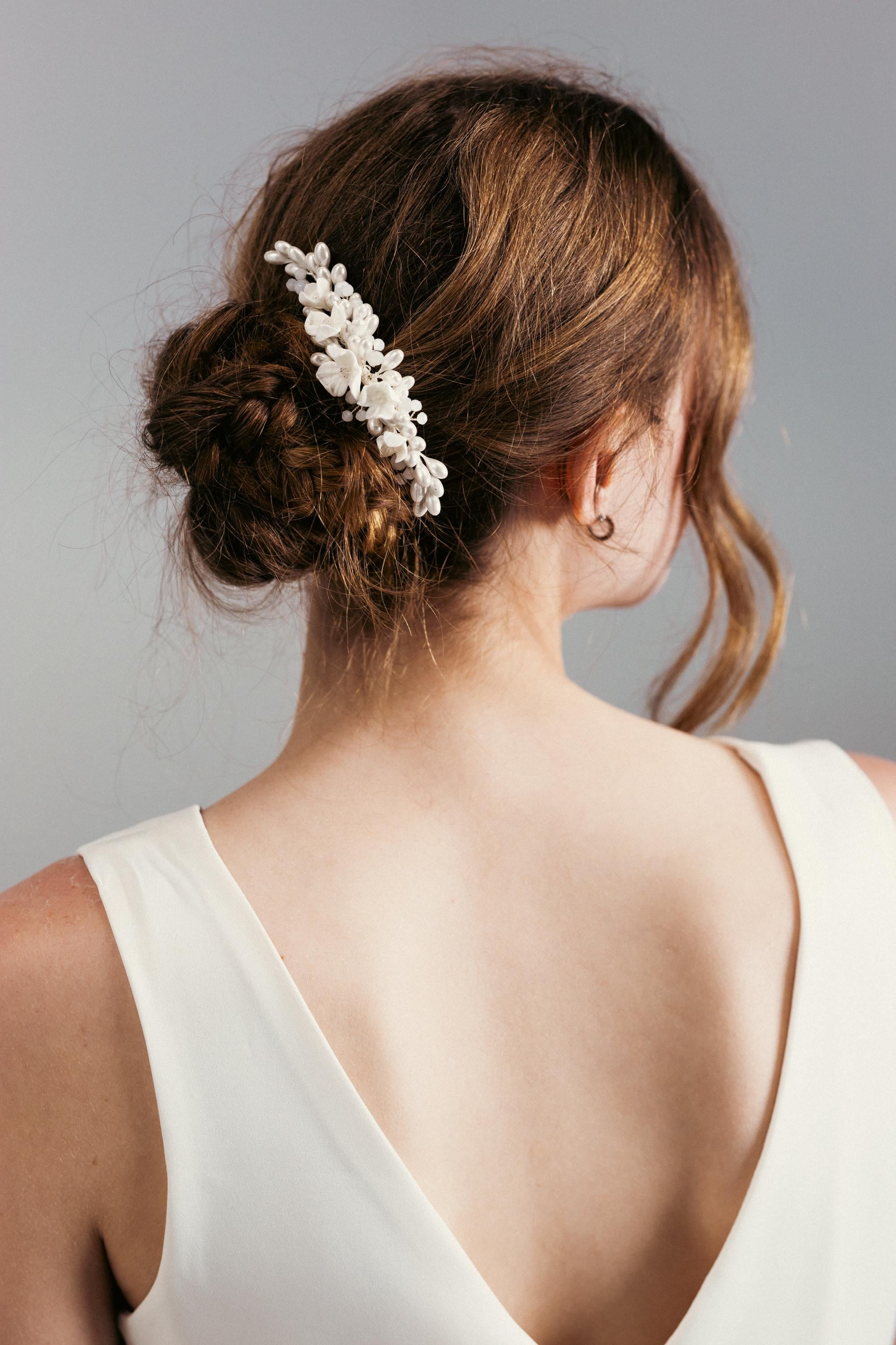 This elegant bridal hair comb features delicate ivory flowers and pearl accents, handcrafted for a t...