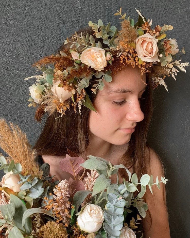 Burnt Orange Autumn Dried Natural Flower Crown, Dried flowers, Brid...