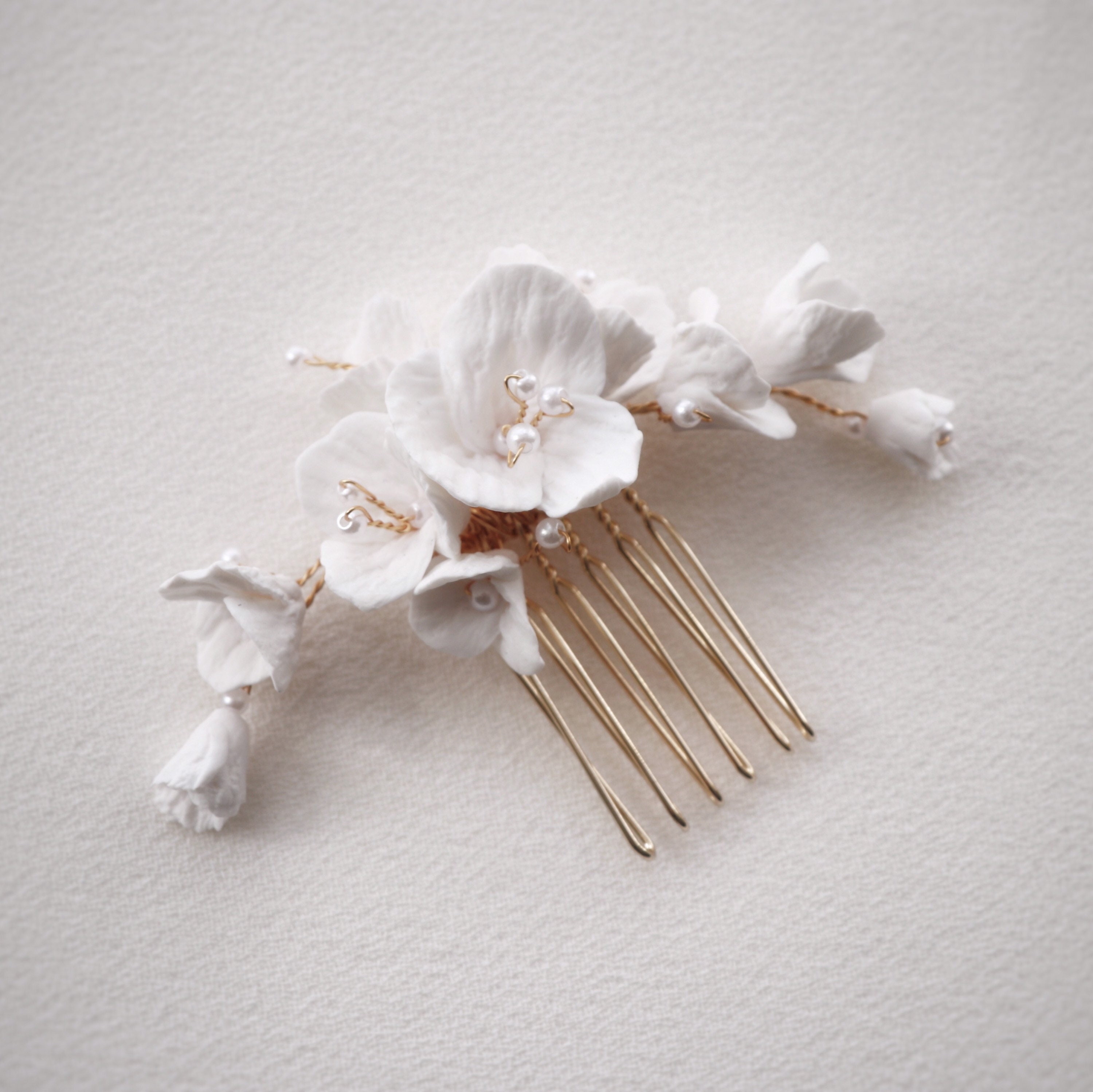 Beautiful bridal hair comb, decorated with ivory clay flowers and glass pearl bead twigs. The hairco...