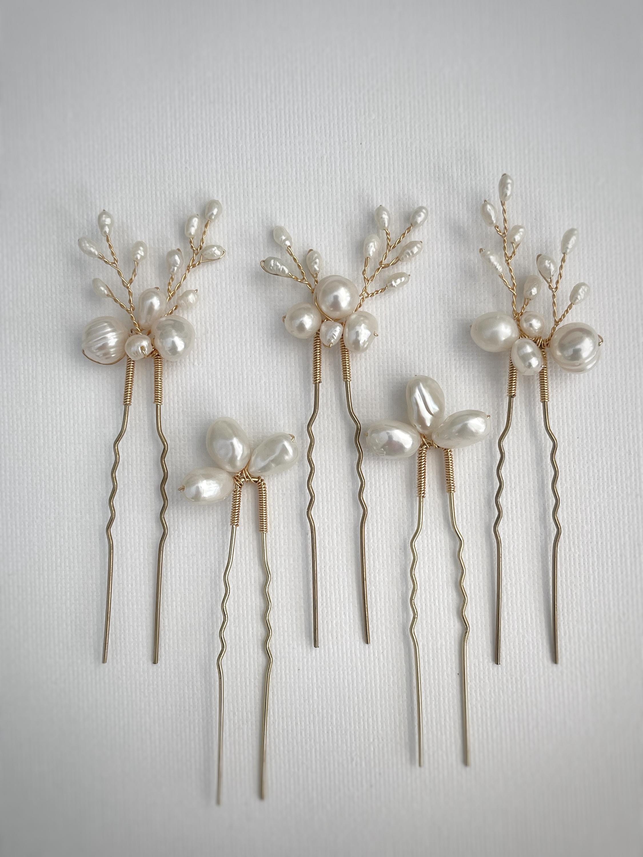 Comes as a set of 5 freshwater pearl hairpins wired in silver, gold or rose gold finish. Please get ...