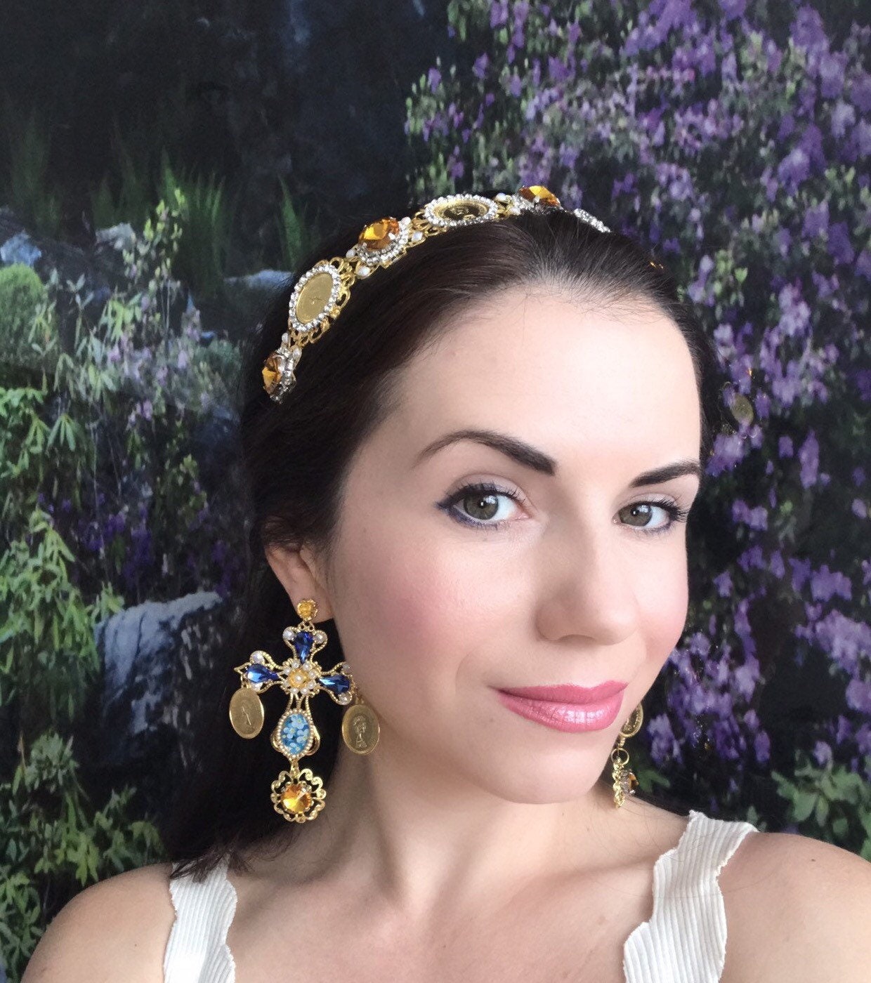 Baroque Headband Antique Coins Dolce bridesmaids Tiara Earrings Eve...