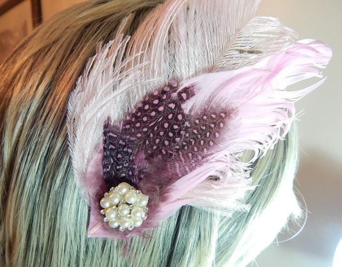 Polka Dot Feather Fascinator - Pink Hair Clip - Pearl Hair Pin - Os...