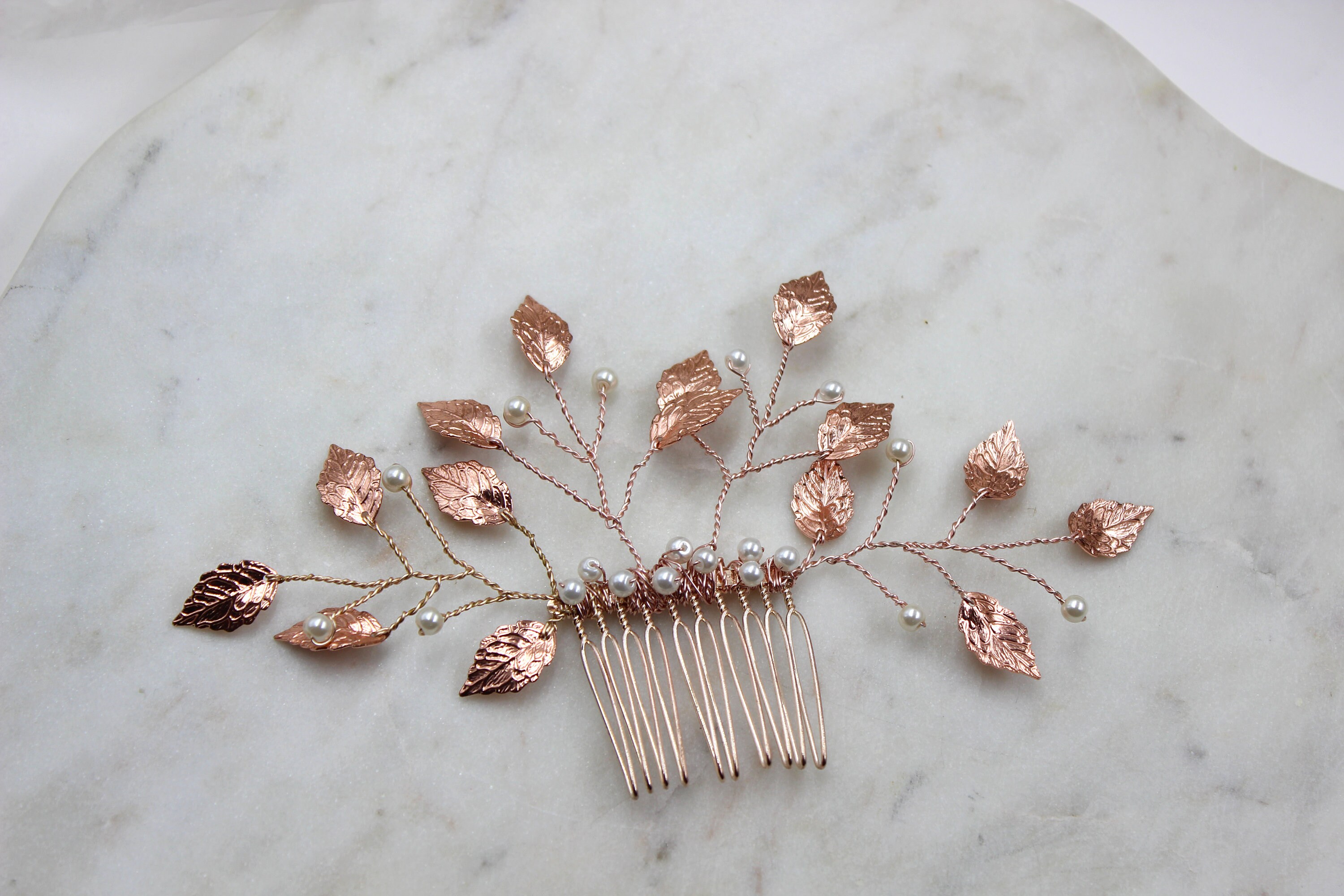 "Beautiful hair comb in rose gold leaves for the nature inspired bohemian style bride. Simple a...