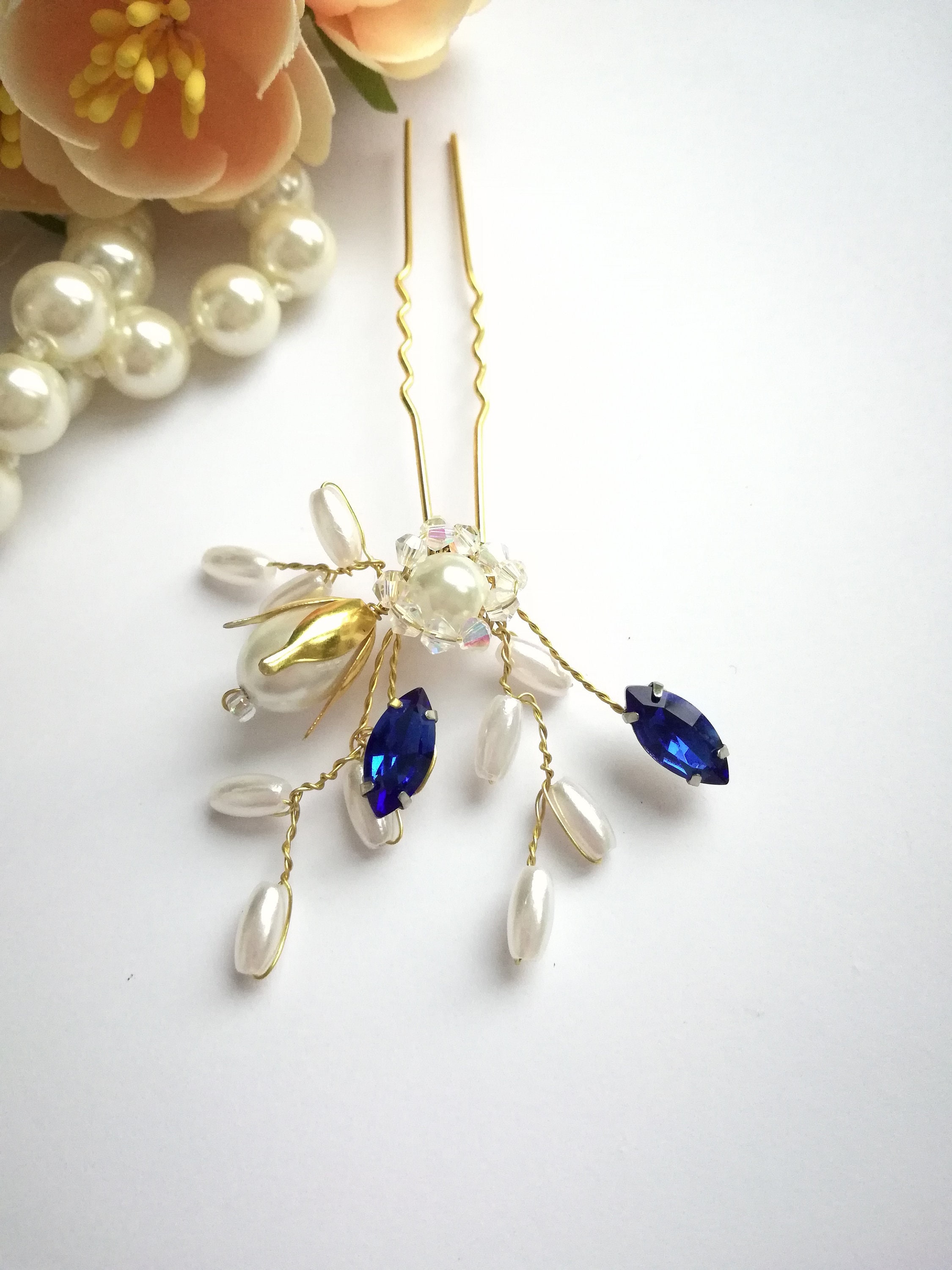Gold hair pin Blue and gold Bridal hair pins Wedding hair pin Sapph...