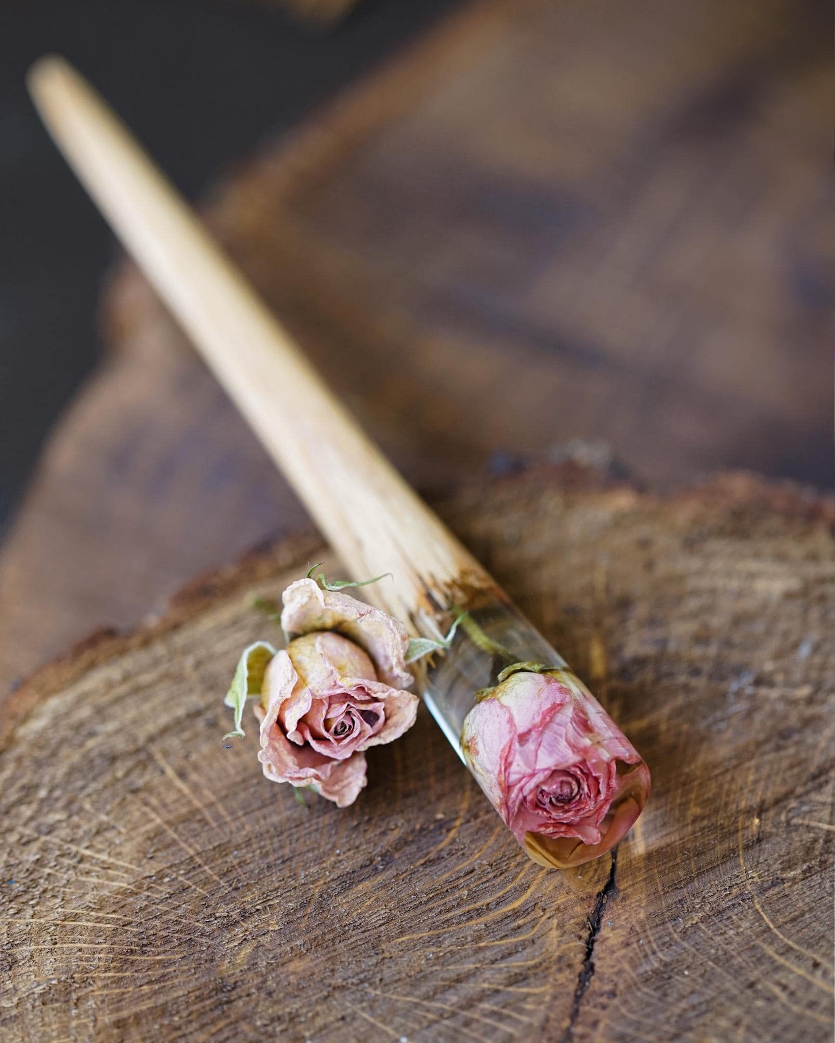 Creamy Rose Wood Hair Stick - Personalized Resin Hairpin with Real Flower | Handmade Wood Hair Acces...