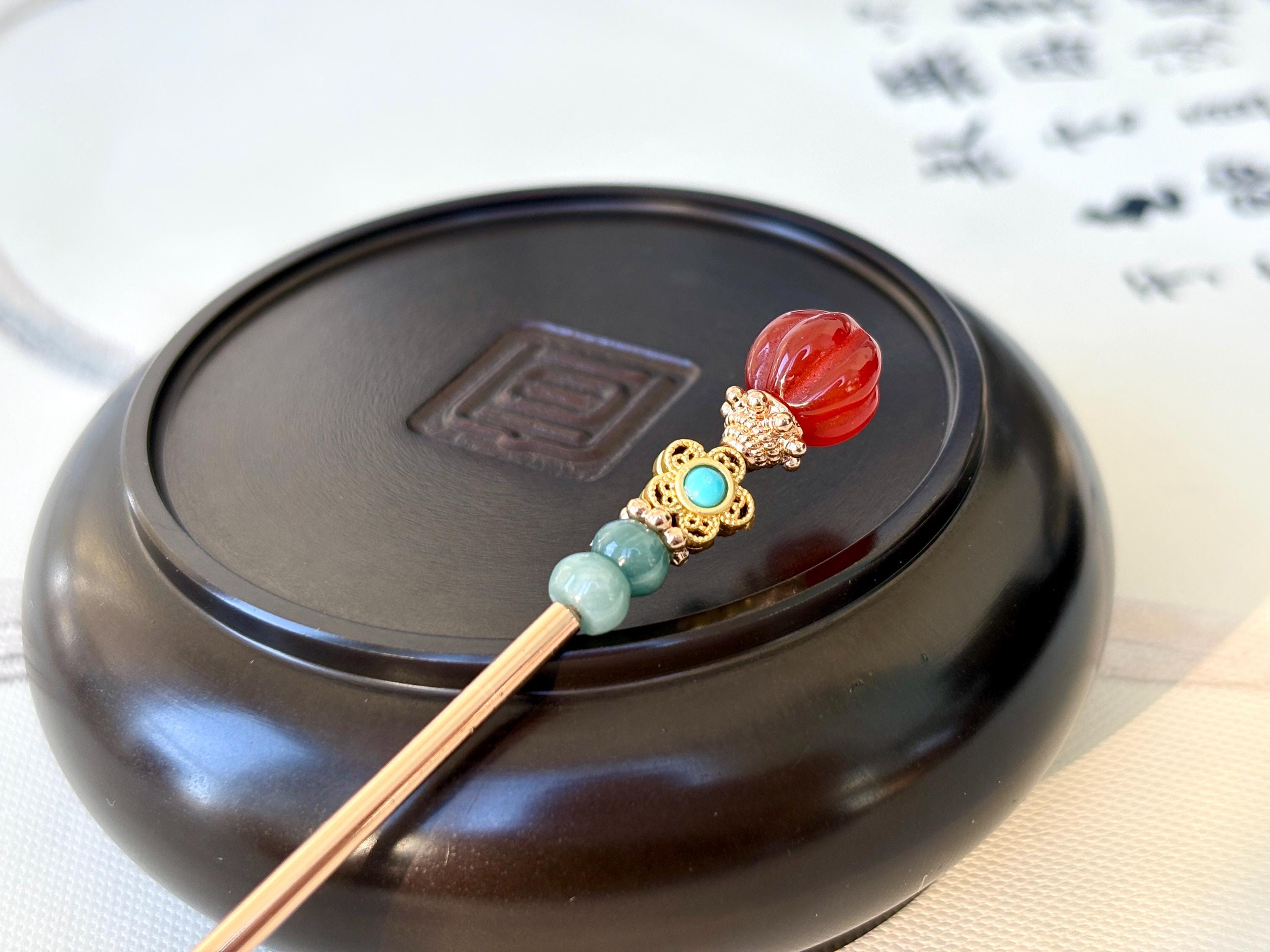 Red agate green jade-Copper Hair Sticks Hair Pins Chopstick-Gemston...