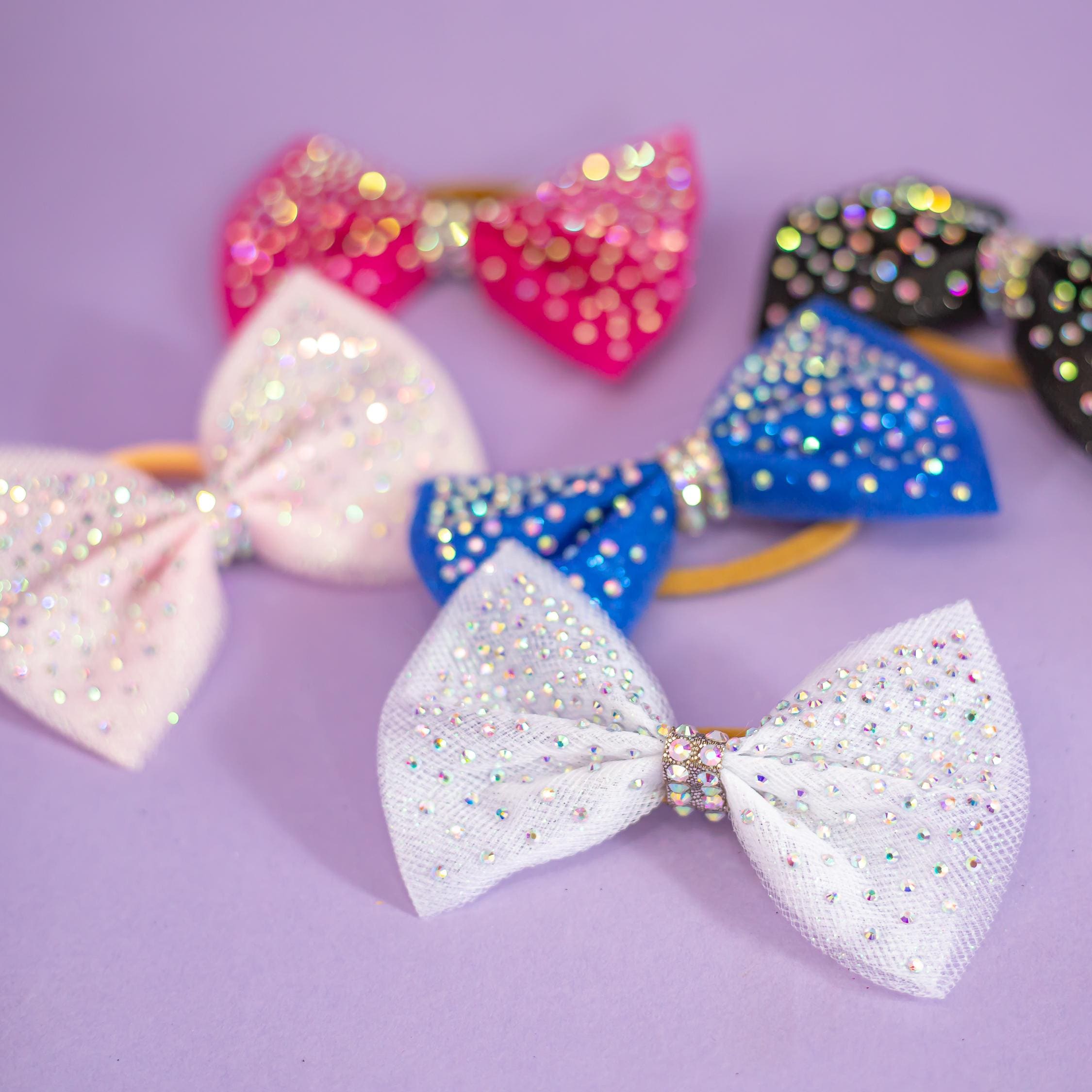 "This gymnastic hair bow is the perfect sparkly accessory for meet day, featuring a bold glitte...