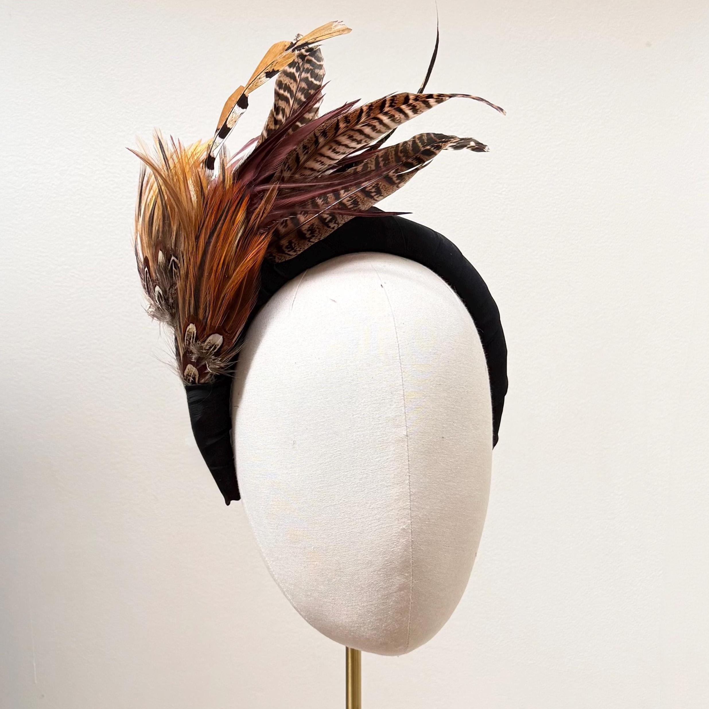 "A crepe silk covered halo Band with gorgeous burnt orange brown feathers with shaped pheasant ...