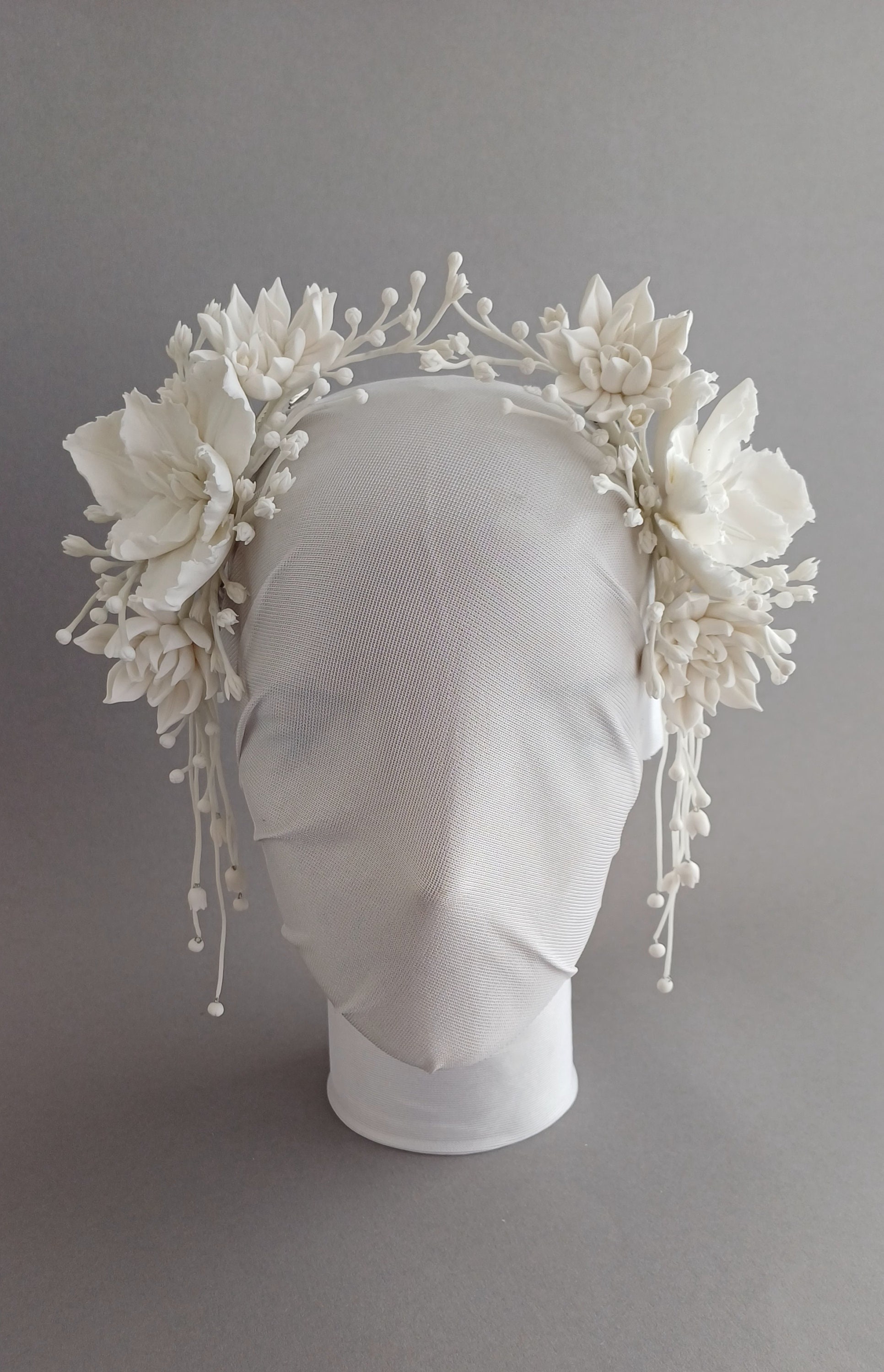 * Design: This romantic bridal flower crown, featuring ivory clay flowers and delicate pearl branche...