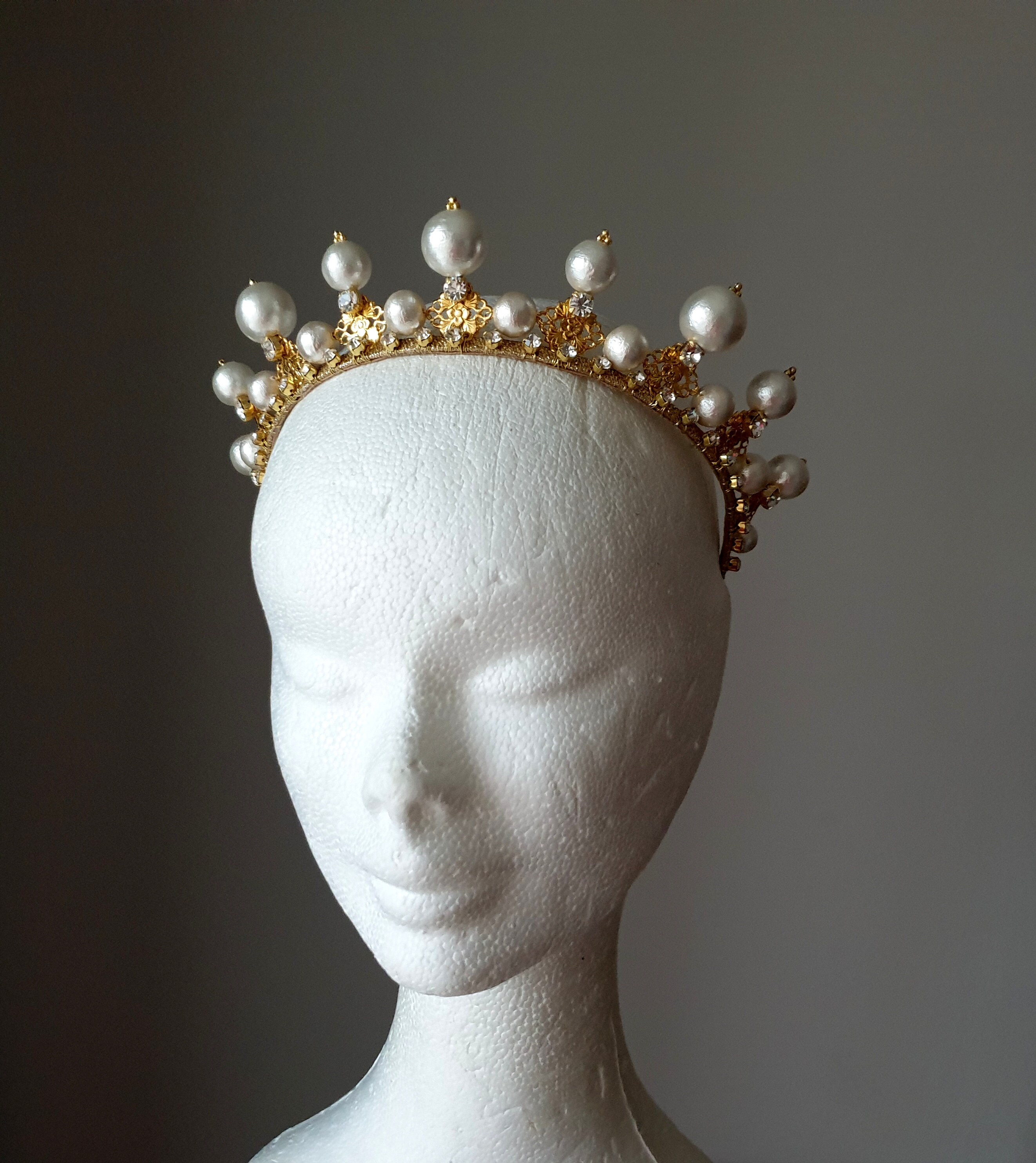 Large pearl crown, Gold bridal tiara, Wedding pearl crown ~MATERIALS~ -Czech glass white clear cryst...