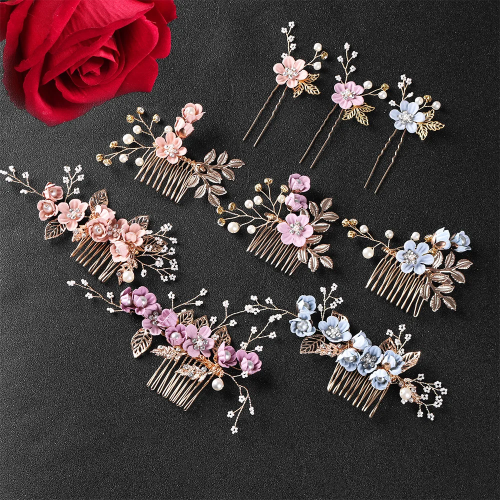 1Pc Fashion Luxury Blue Flower Hair Combs Headdress Prom Bridal Wedding Hair Accessories Gold Leaves...