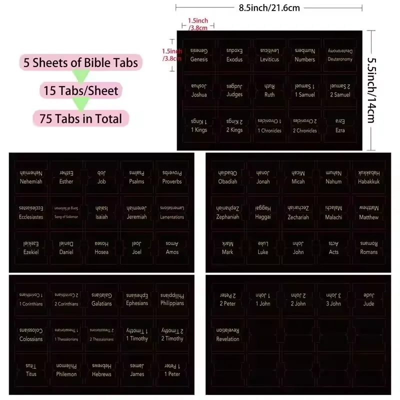 75pcs PVC Self- adhesive Bible Index Tabs New & Old Testament Tabs Matte Black Laminated Gold Fo...