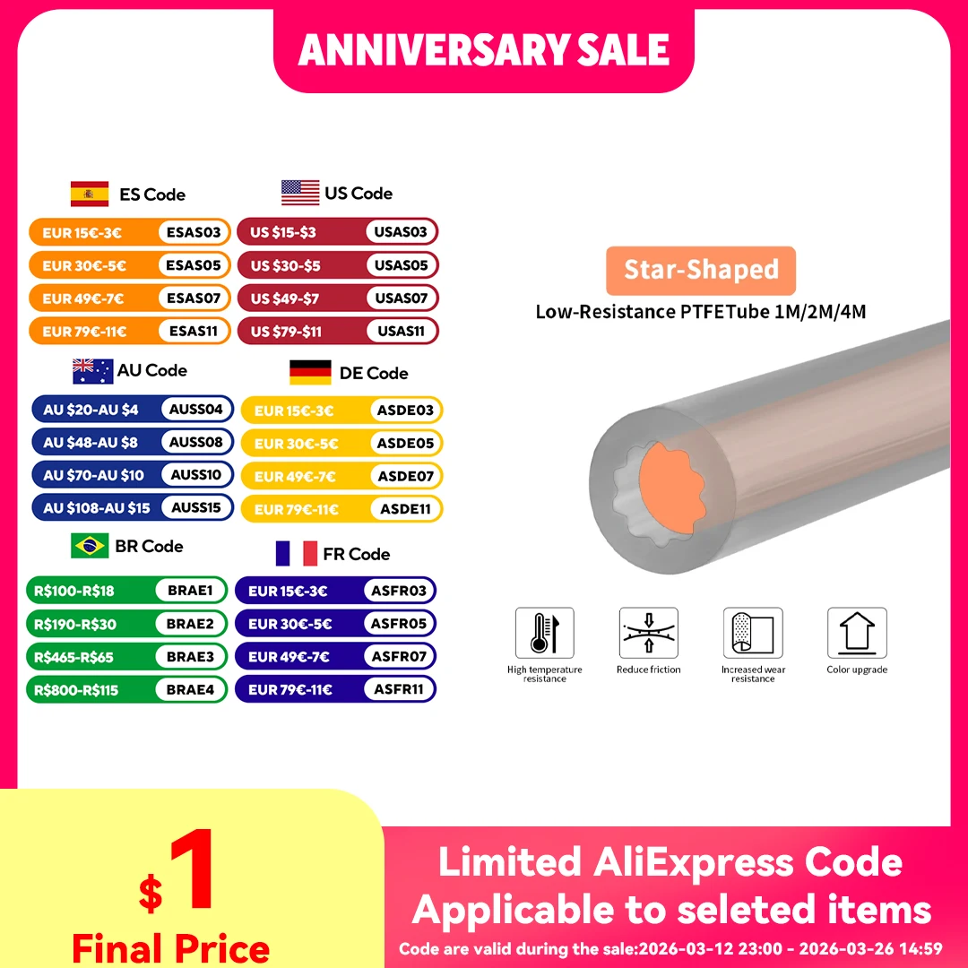 For Bambu Lab Creality Voron Anycubic Star Shaped PTFE Tube 4mm OD Low-Resistance High Temperature R...