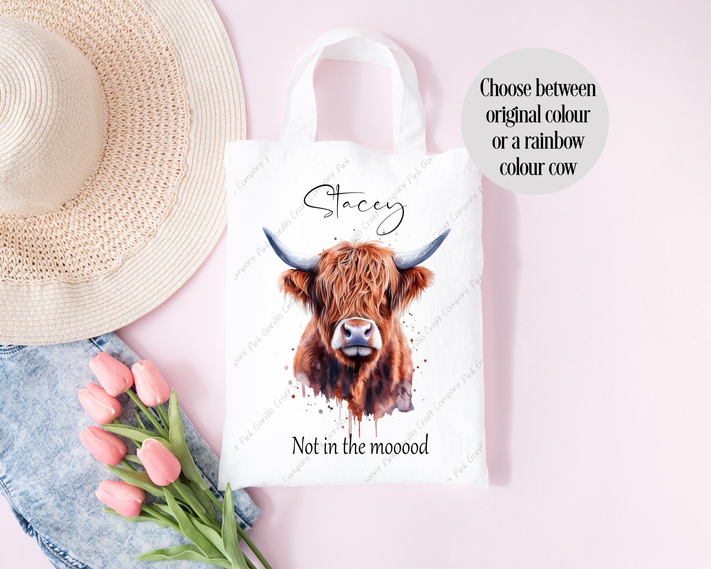 A stunning mini tote bag personalised with a beautiful highland watercolour cow that is available in...