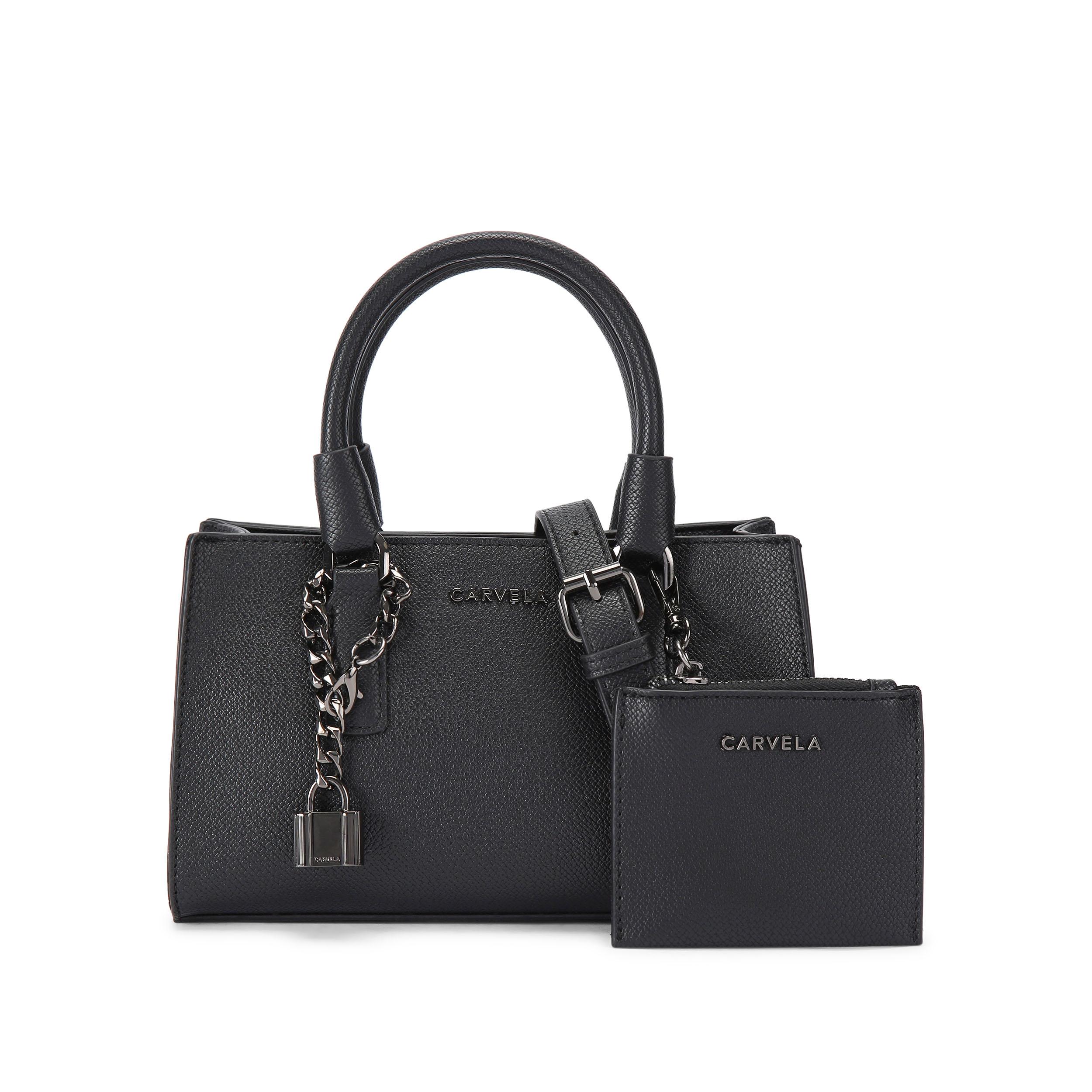 This Carvela Latte top handle bag sits East to West for an elongated look in a textured black leathe...
