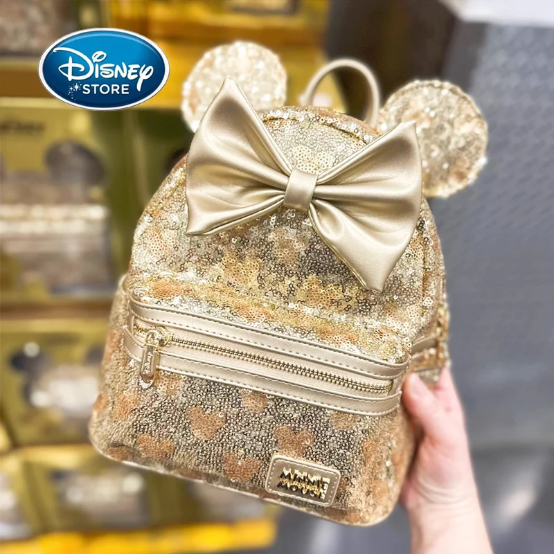 Disney Gold Sequin Mickey Minnie Mouse Backpack Cute Compact Mini Bag With 3D Ears & Bow Travel ...