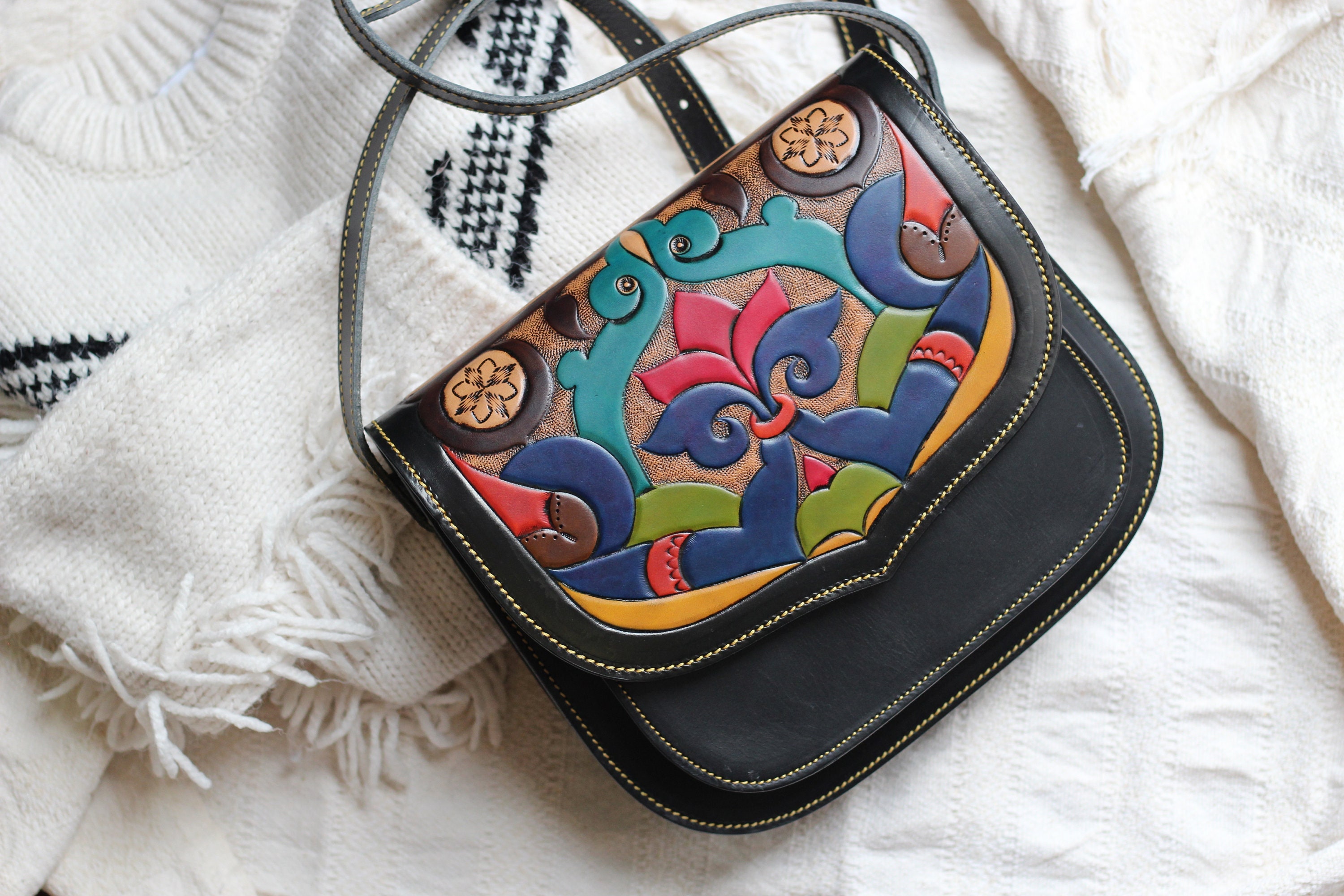 Embossed leather bag, leather purse for women, hand made leather ba...