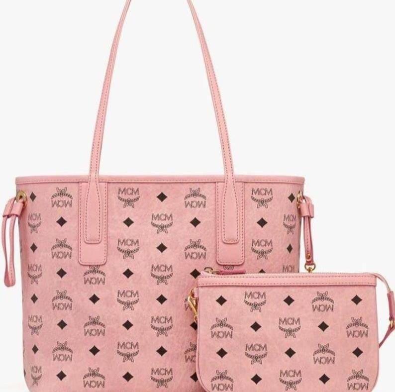 MCM Liz Reversible Visetos Tote Bag in Pink with Matching Pouch, Designer Monogram Genuine Cowhide L...