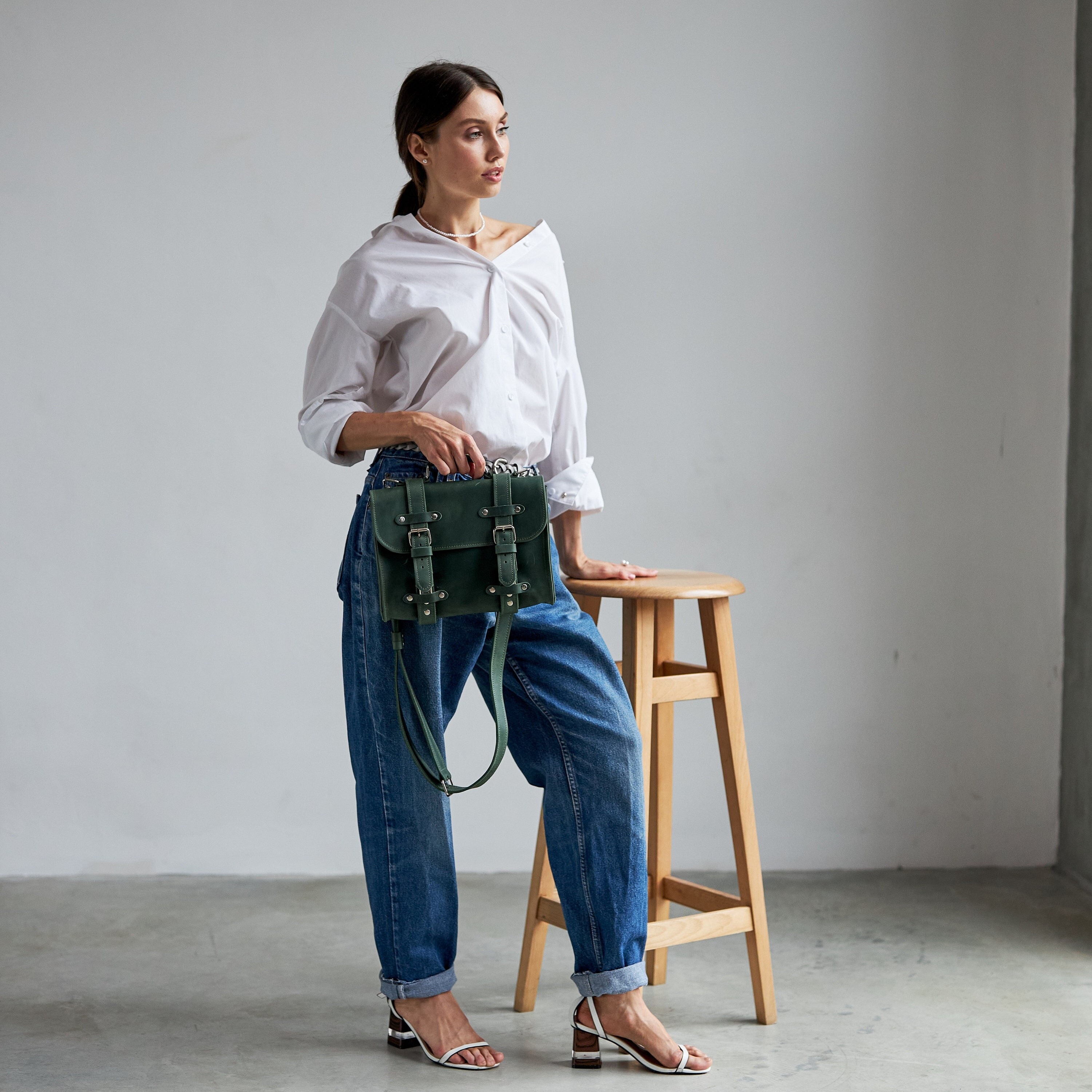 "Genuine leather minimalist messenger bag for women. Buckle closure, top handle and adjustable ...