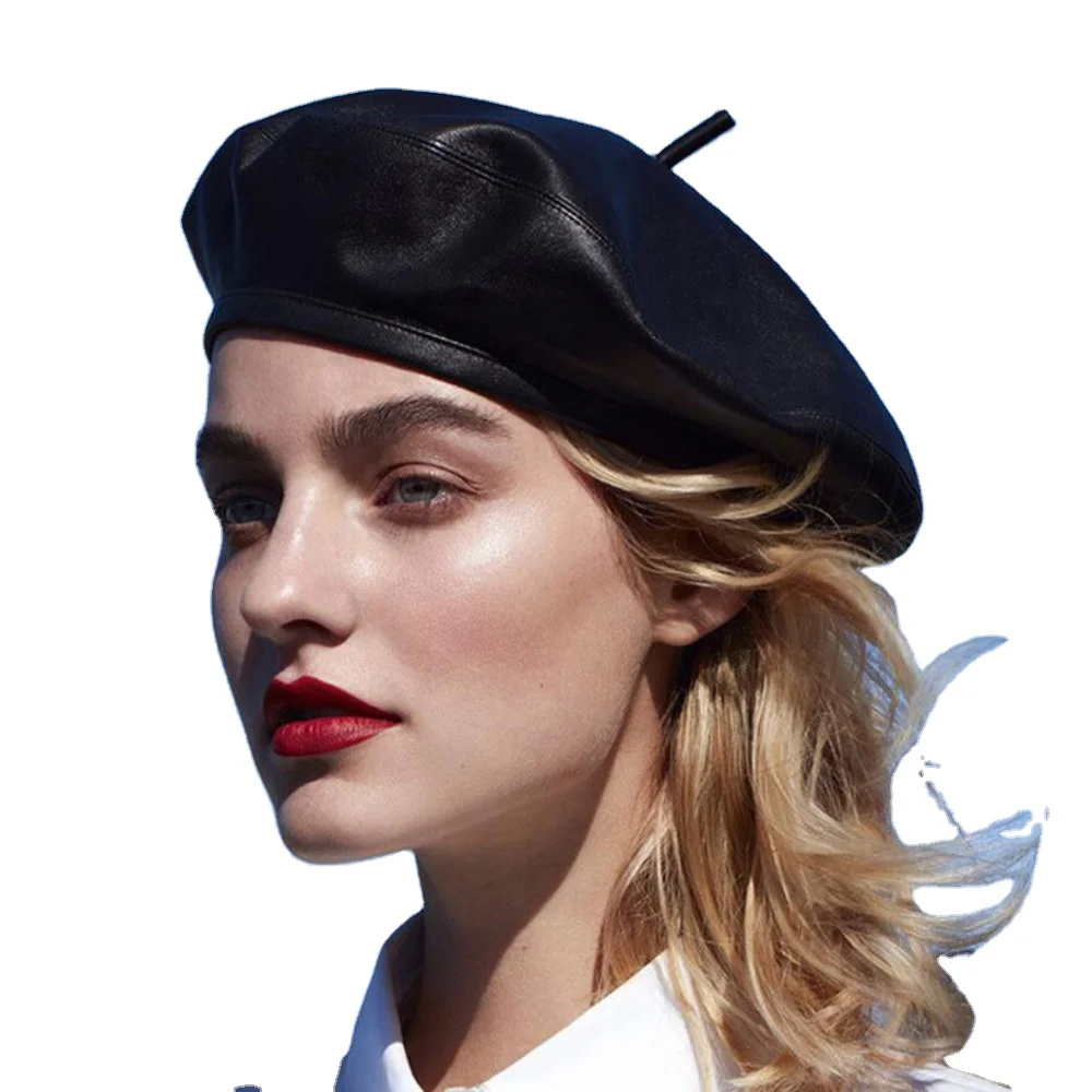 Fashion Winter Cap for Women Solid PU Leather Beret Cap French Blac...