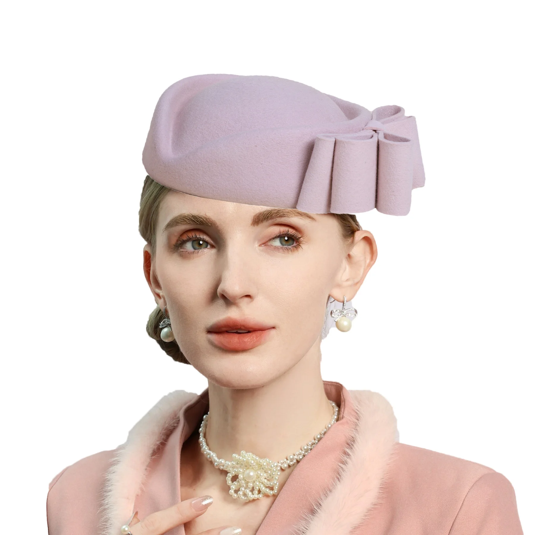 Winter Pink Wool Fascinator French Beret Bowler Hats With Bowknot Elegant Wedding Formal Church Tea ...