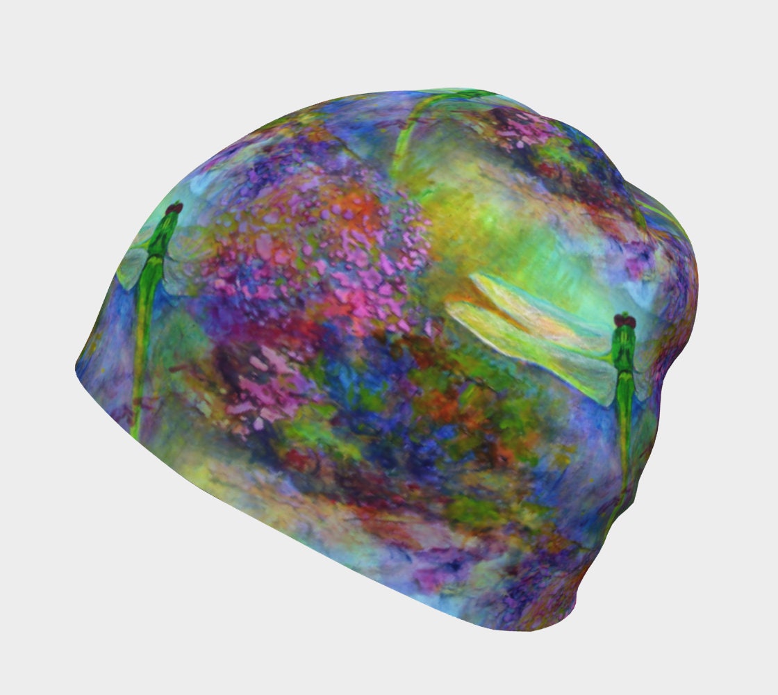 "Bamboo Beanie Hat with a Spirit Animal Purple Dragonfly on a Soft Blue Green Teal Background T...
