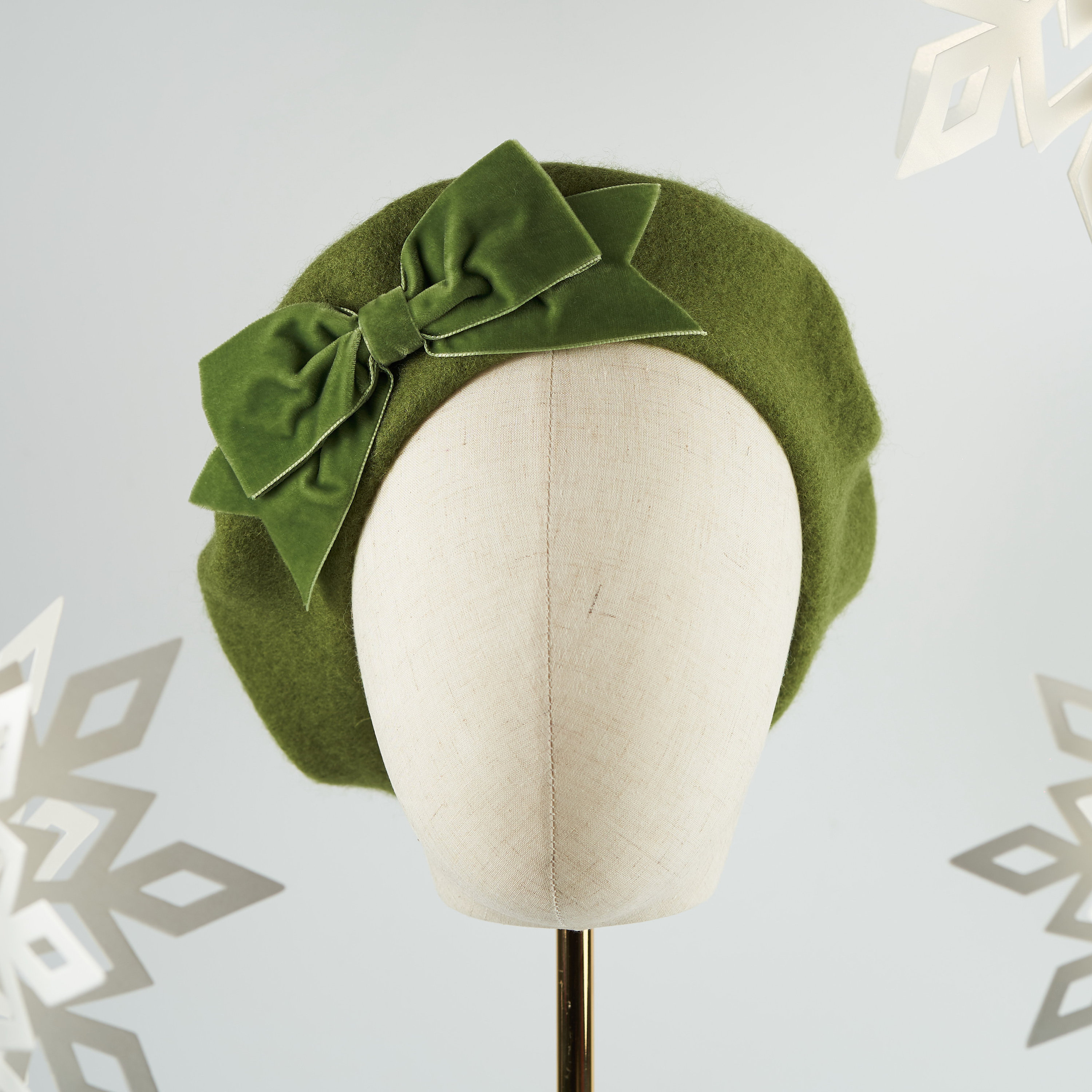 Moss Green Wool Felt Beret Hat with Green Velvet Ribbon Bow, Green ...