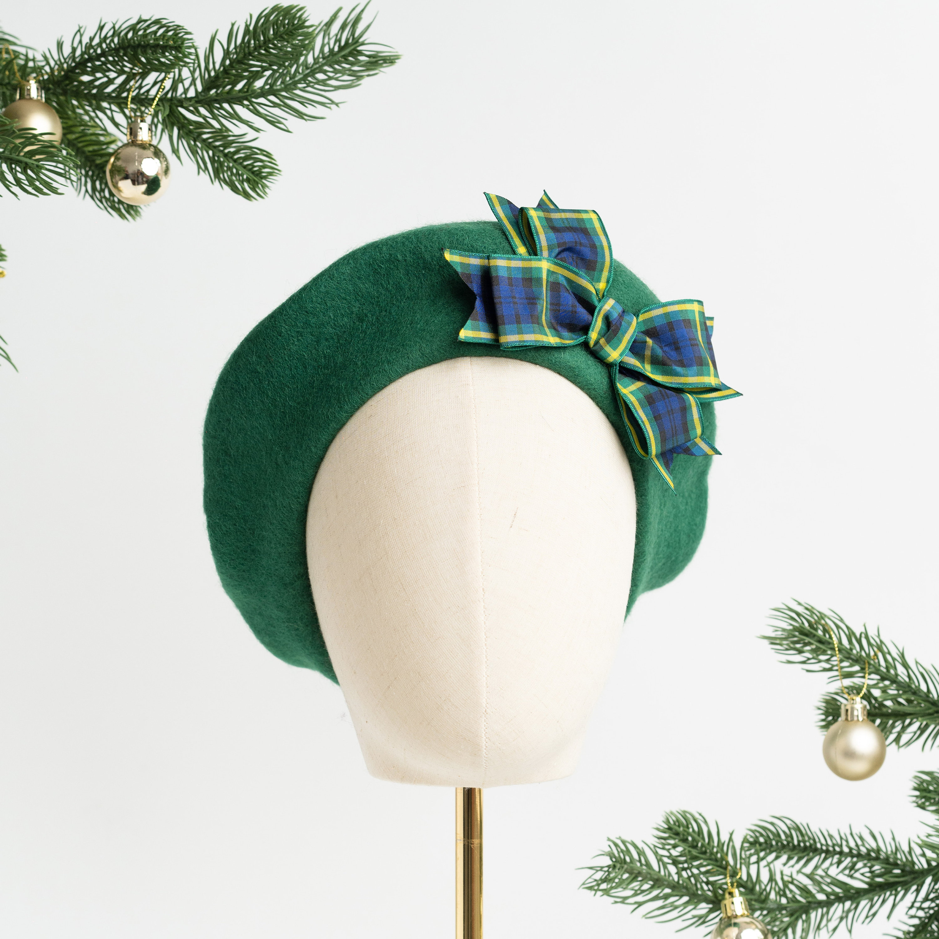 Emerald green wool felt beret hat embellished with a handsewn Gordon tartan ribbon bow. A French sty...