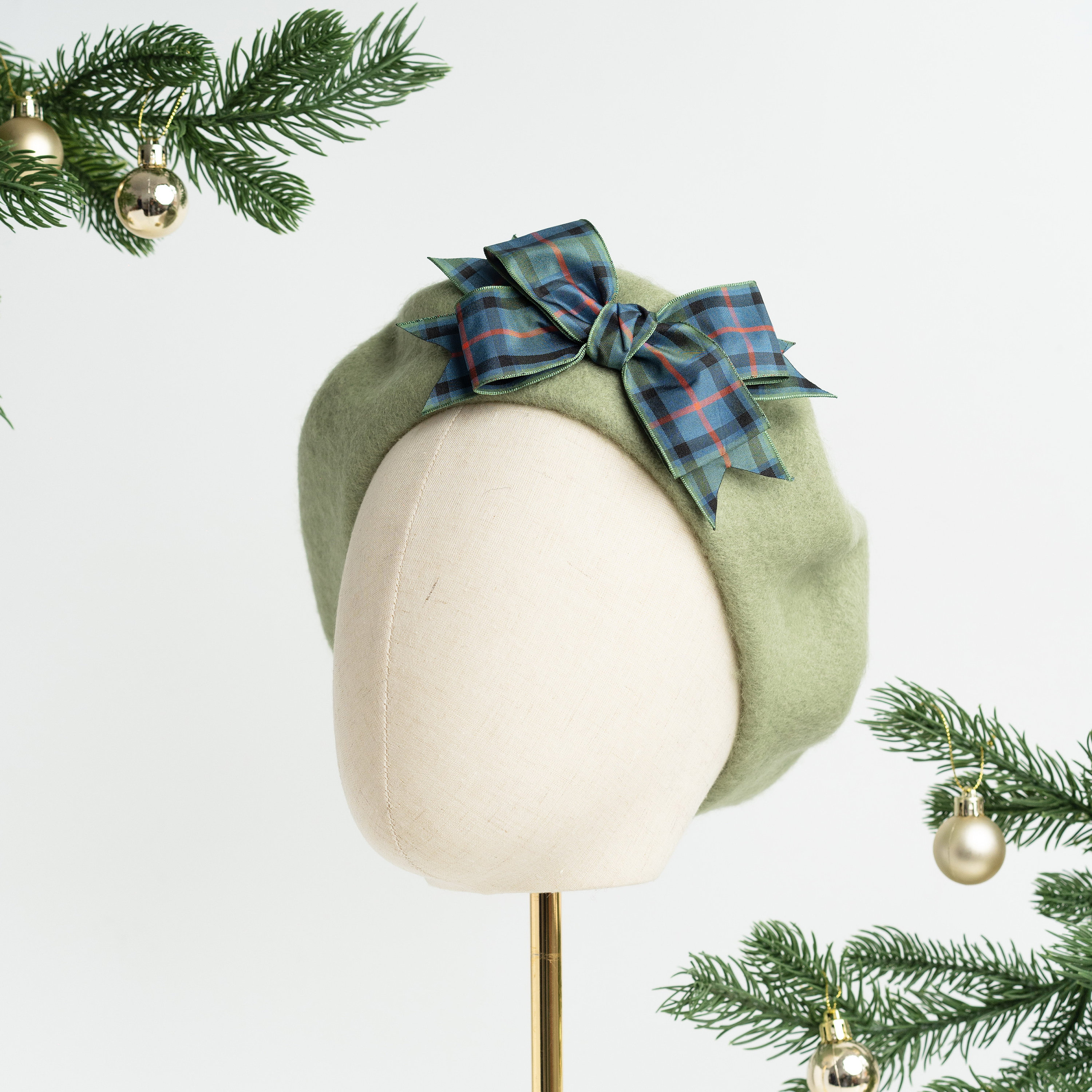 Sage green wool felt beret hat embellished with a handsewn Flower of Scotland tartan ribbon bow. A F...