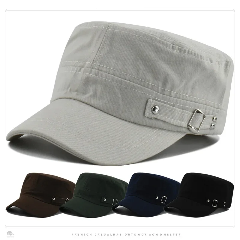 Silver Metal Side Button Military Hat Cotton Short Eave Flat Top Hat Solid Color Multi-color Adjusta...