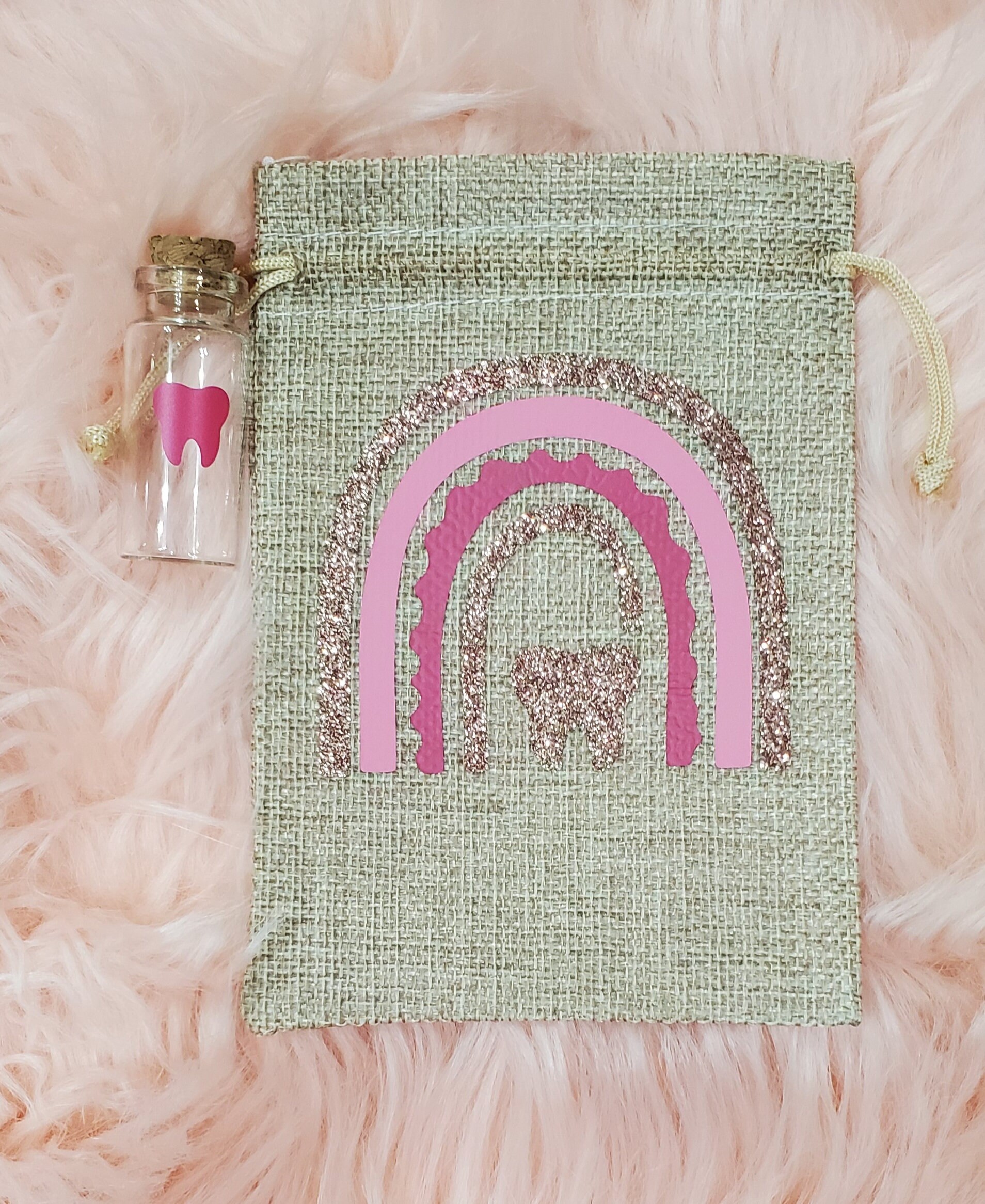 Rainbow Burlap Bag (4x5) with a glass container to keep your lil' ones tooth safe for the Tooth Fair...