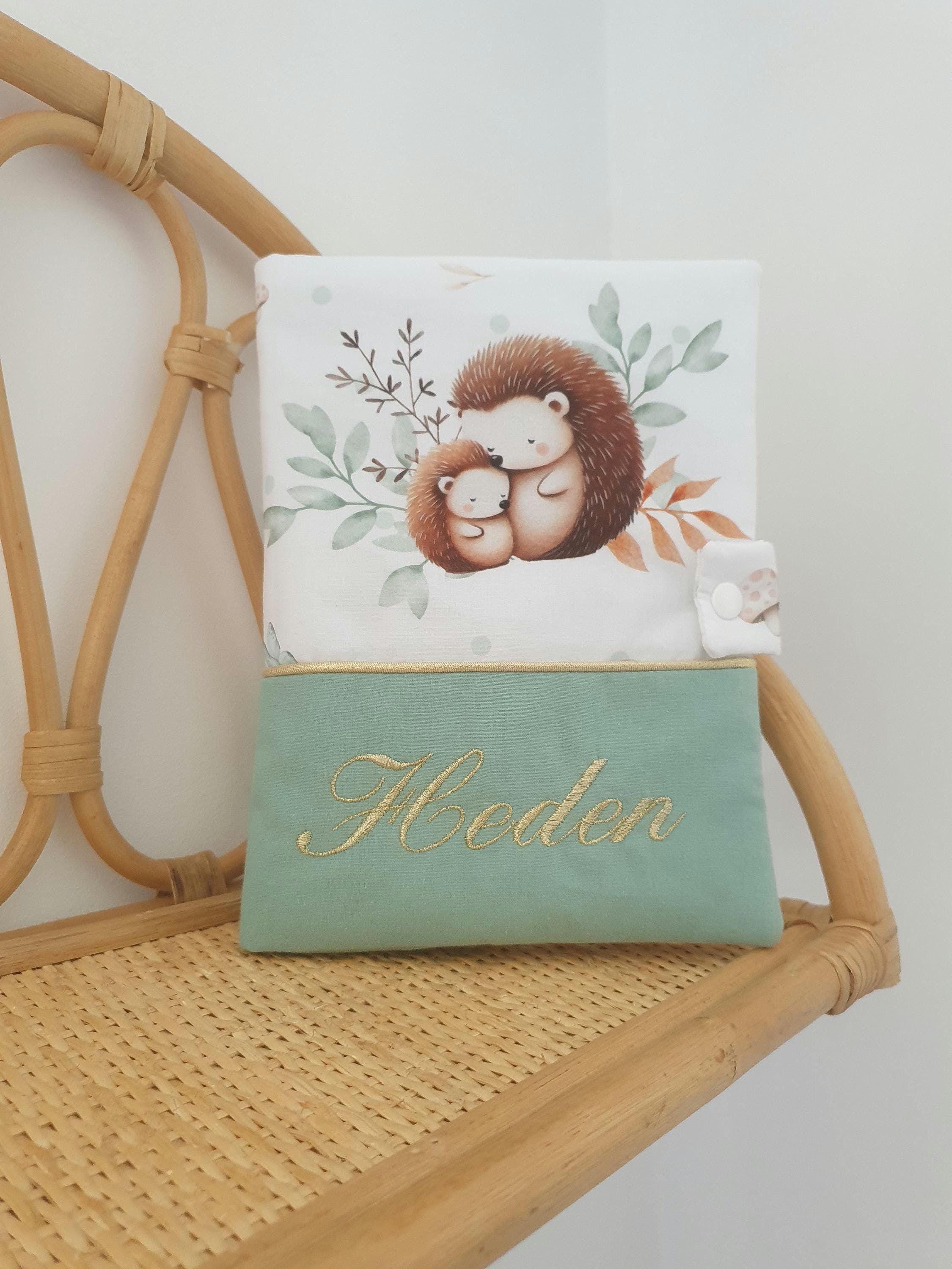 Personalized and padded health record cover for baby on the theme of hedgehogs, mother and baby, in ...