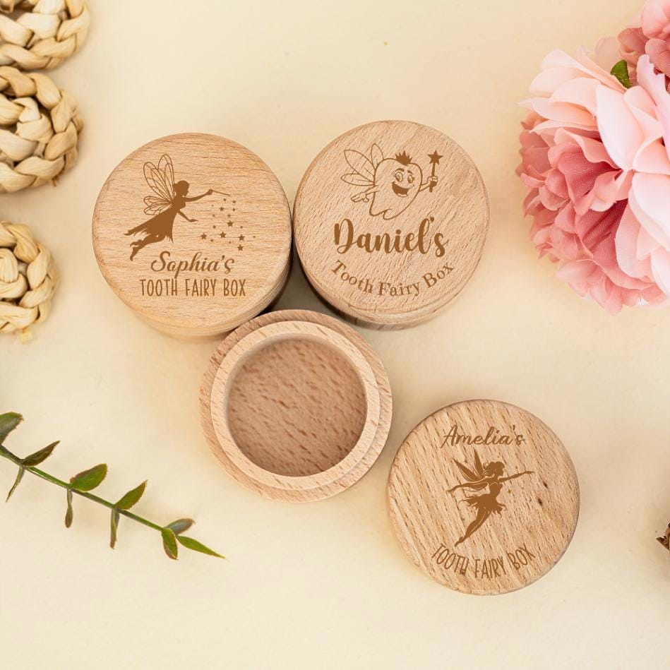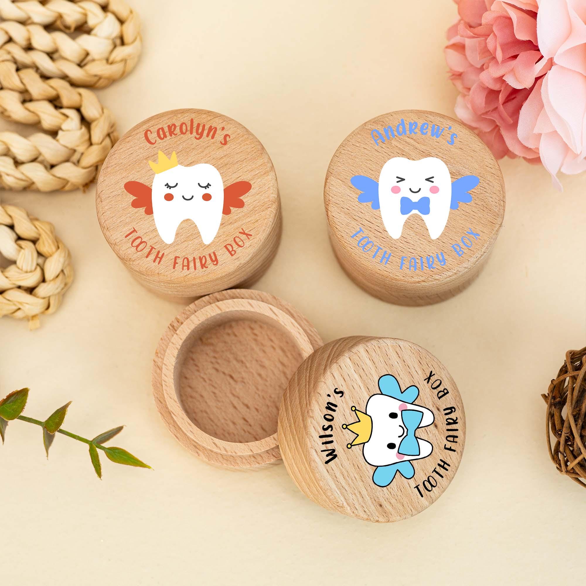 "This versatile wooden tooth box serves as a charming fairy tale gift idea for children's keeps...