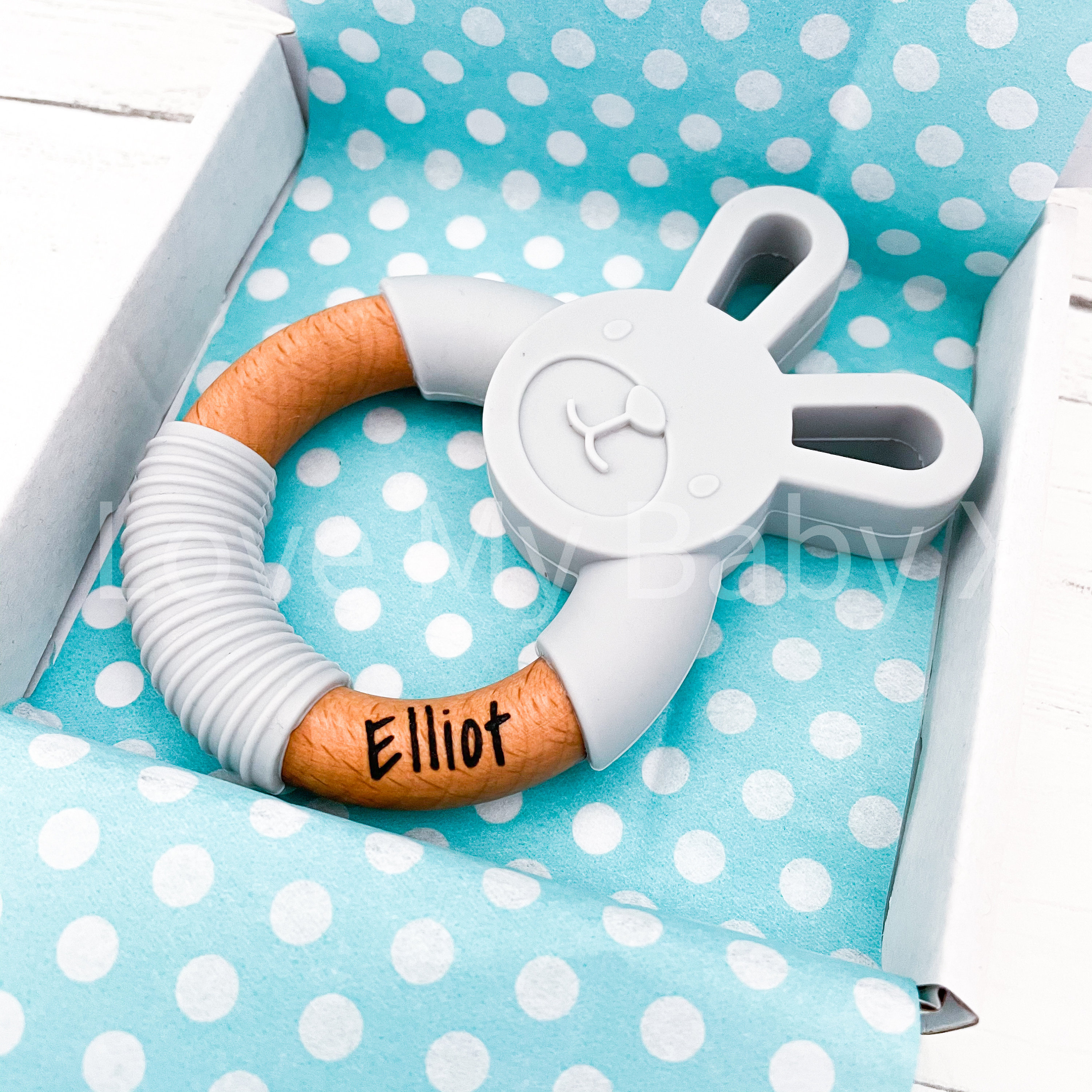 Bunny Safe Teether | Grey Ring Teether | PERSONALISED Teething Toy ...