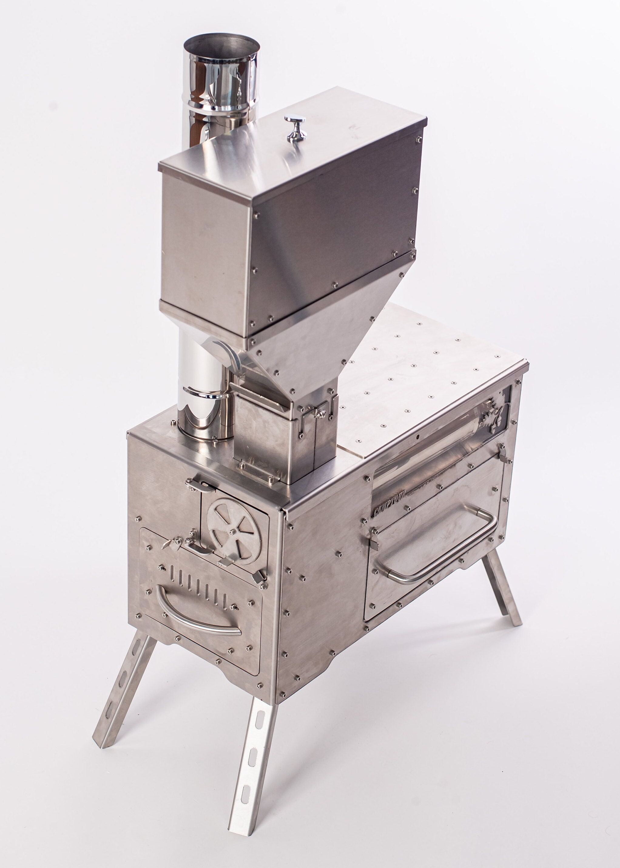 Gravity feed pellet stove with oven and cook top! Mini hot tent sto...