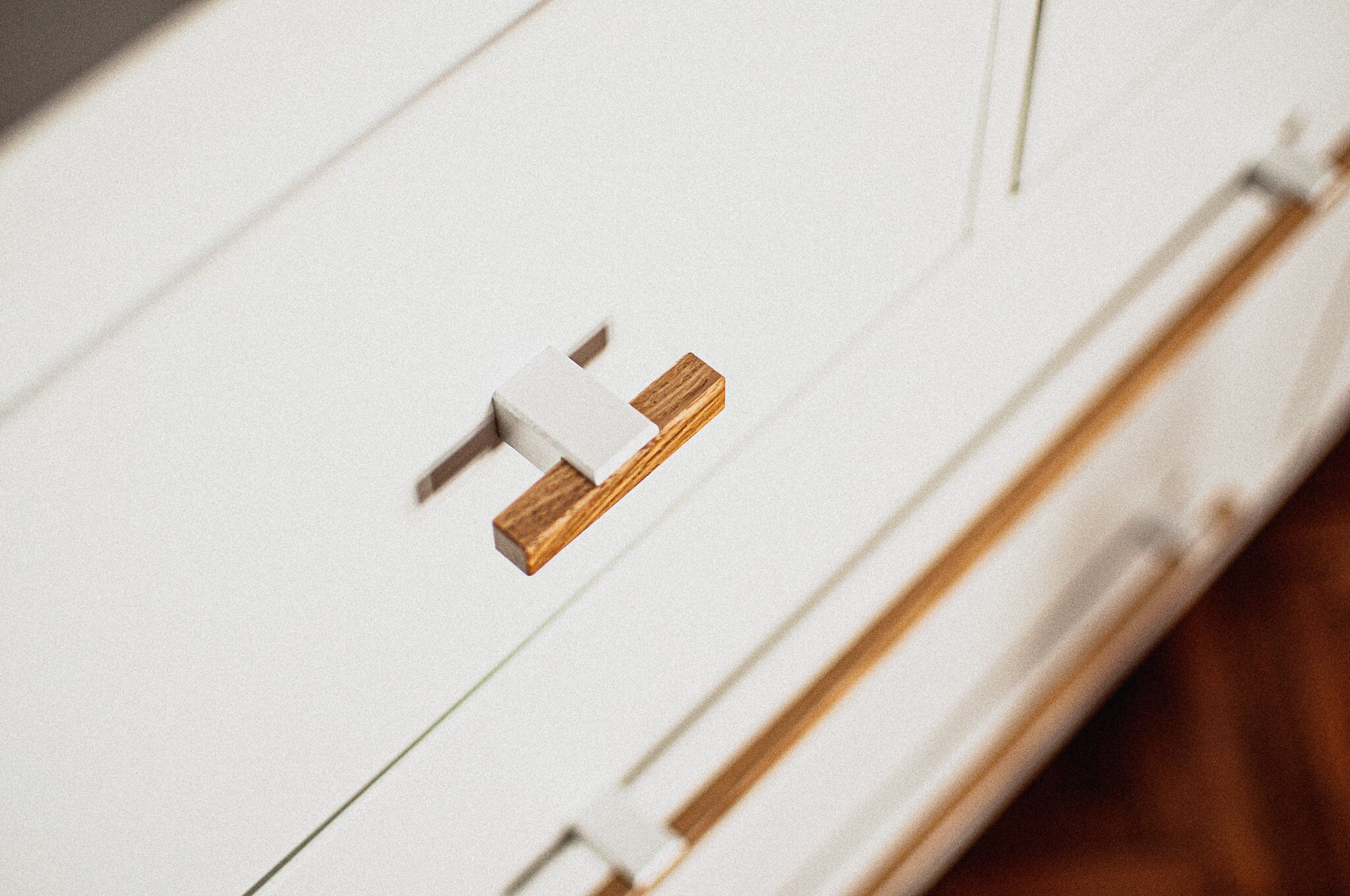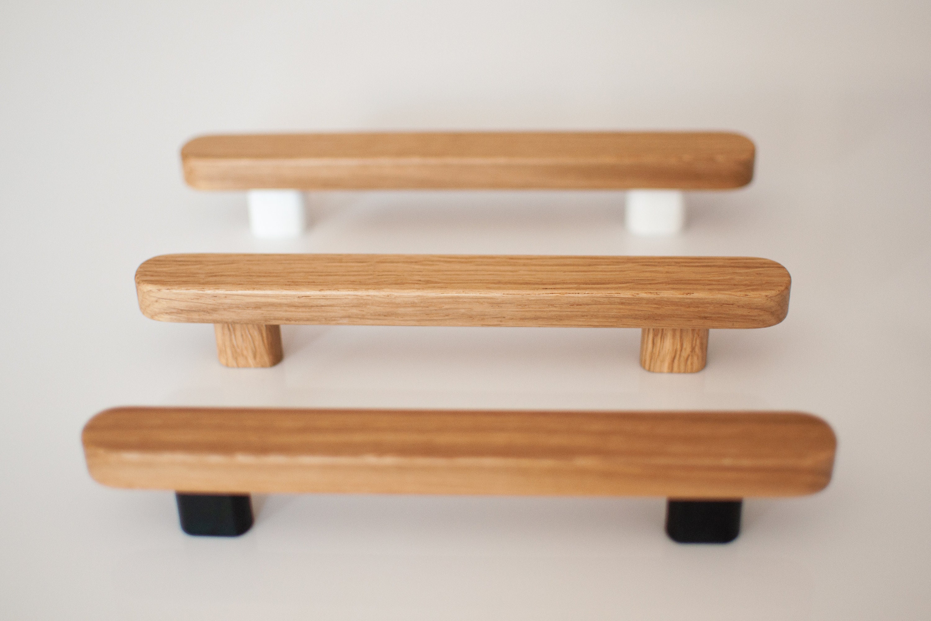 "Wooden furniture handle: - solid oak wood - 2 elements are painted black, white or natural oak...