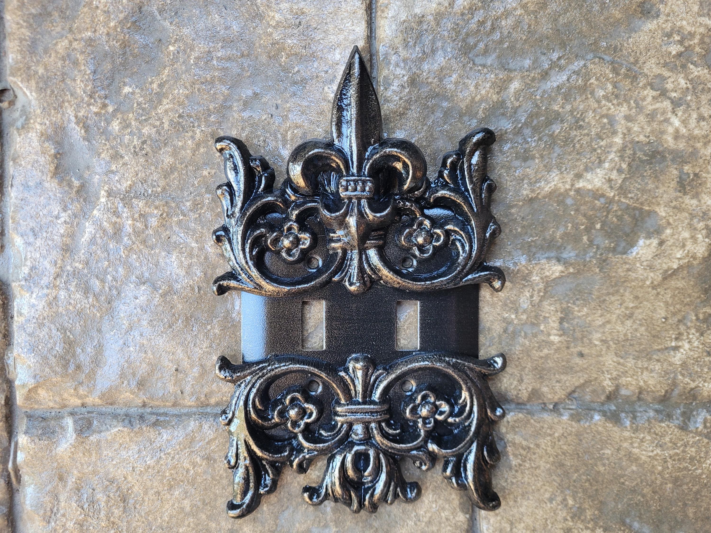 - This is a triple switch plate cover made of metal. It has two metal medallions with leaf and fleur...