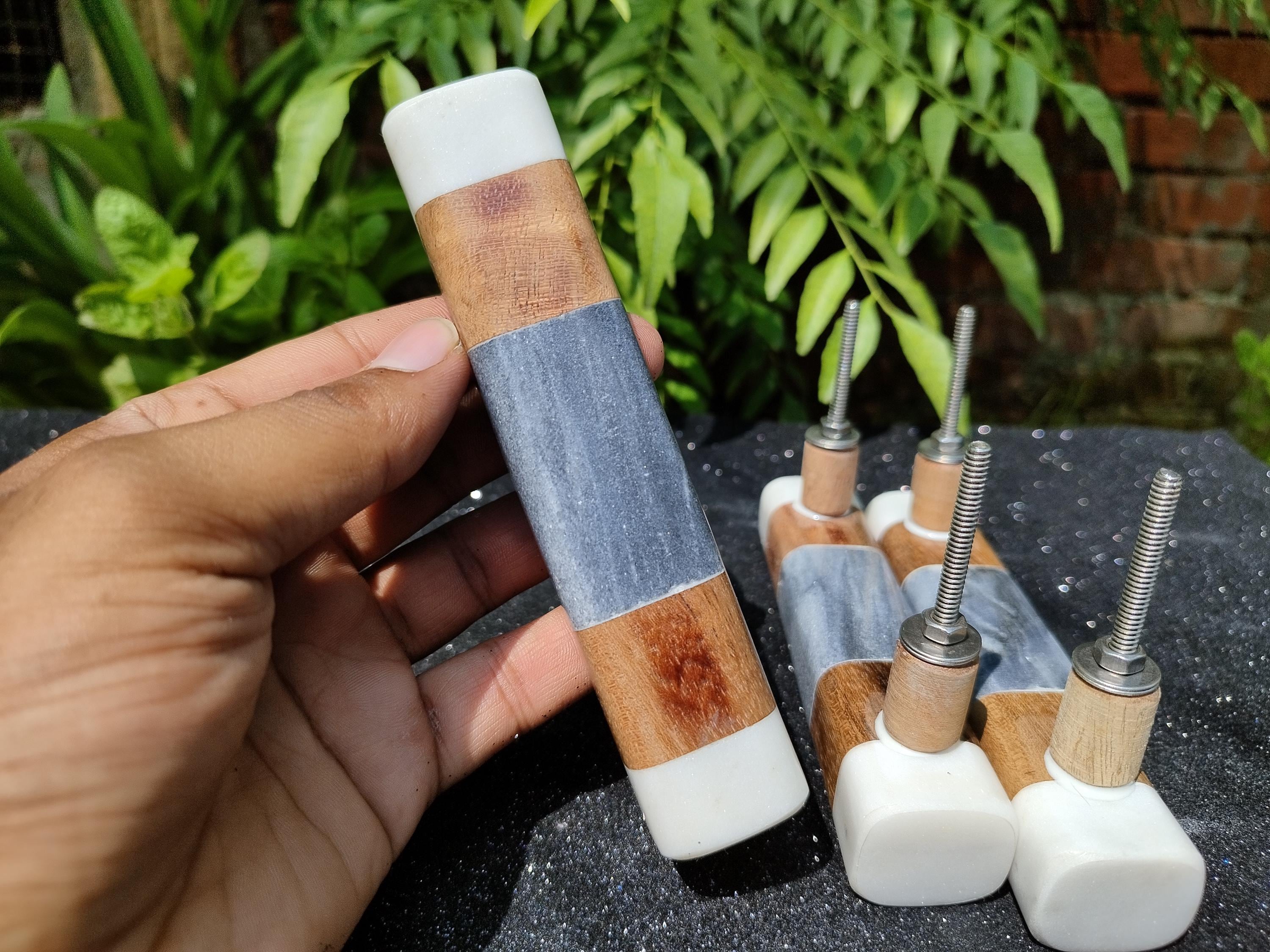 Set of Elegant White Marble, Grey Marble Acacia Wood Drawer Pulls, ...