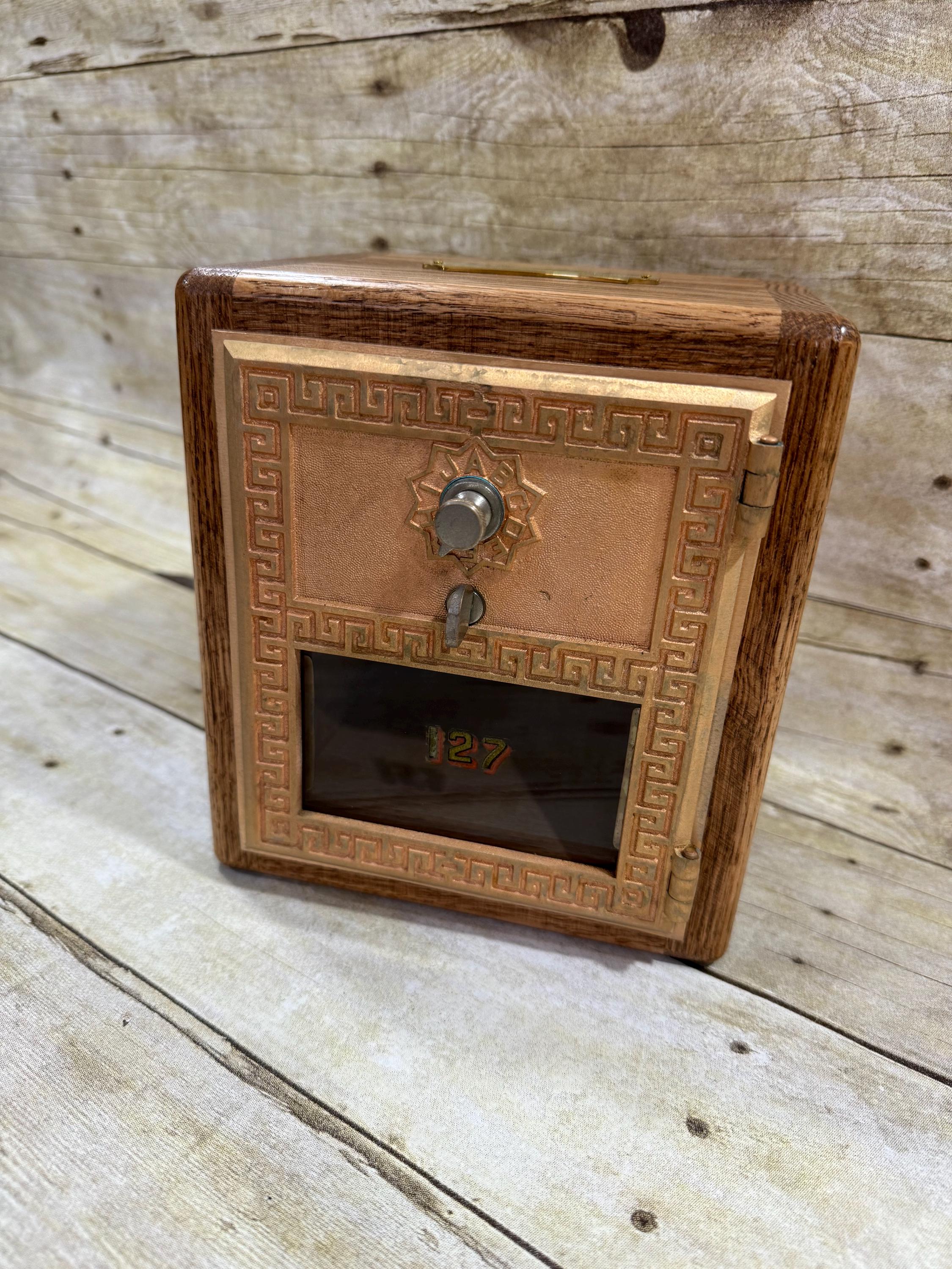 "Original Post Office Box Door Banks handcrafted in beautiful red oak using Vintage Post Office...