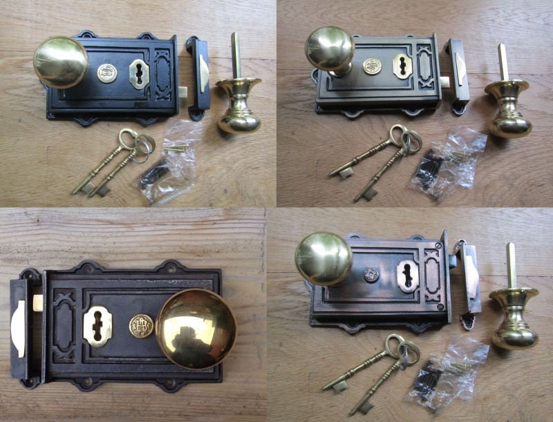 "Cast iron lock set with forged brass door knobs Knobs Available in polished brass or Antique c...